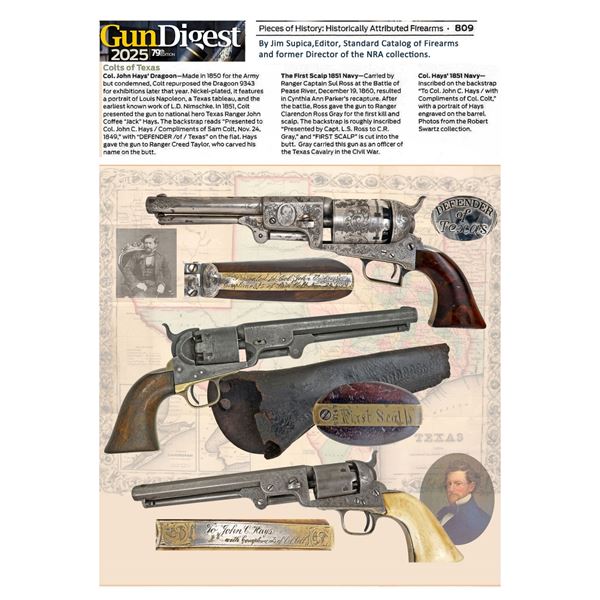 UNATTACHED ACCESSORIES: large file of copied receipts, correspondence, best 20 page factual account of Pease River fight, and participants in 2009 article from Southern Western Historical Quarterly. Copied Christies 2001 catalog description (when the story behind the gun was then unknown) and price realized of $99,500, a record price at the time against a $20,000 estimate showing the desirability of historic Texas arms. Photocopy of John Wayne picture reprising the role of Ethan Edwards in "The Searchers" Fall 2018 issue of "The Texas Gun Collector" featuring this gun on the cover. Photocopy of the cover of "Empire of the Summer Moon" by S.C. Gwynne, a biography centered around Quannah Parker and Cynthia Ann Parker. Photocopy of 2025 Gun Digest page 809 showing this gun in "Colts of Texas" article by Jim Supica.