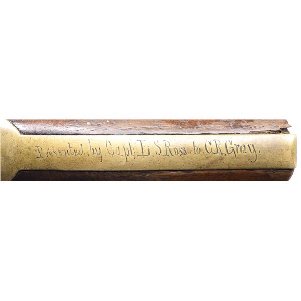 Possibly the most famous & historic of any Colt percussion pistol with fantastic pedigree is this 1859 manufactured Navy revolver inscribed on grip strap: “Presented by Capt. L. S. Ross to C. R. Gray” and “First Scalp”. This gun is featured by Jim Supica, former curator of the NRA Museum, in his sixteen-page article, "Pieces of History: Historically Attributed Firearms", Gun Digest, 2025 Standard Catalog of Firearms, p. 809.