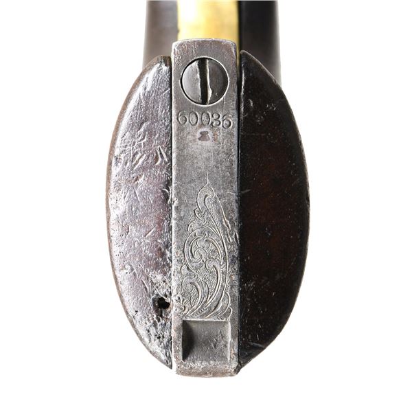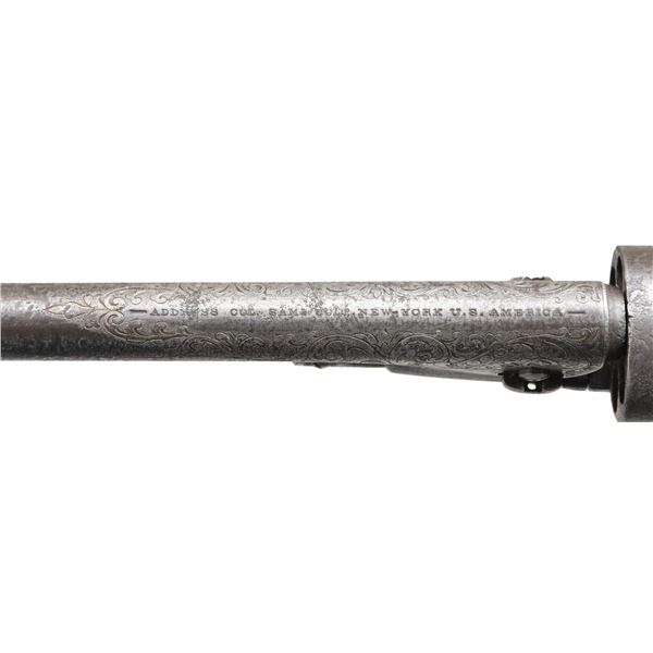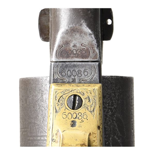 REVOLVER. Cal. 44. S# 60036. Bbl. 8", round with a New York address and German silver blade front sight. Six-shot round, rebated cyl. with naval scene roll engraving. Brass trigger guard. Frame, bbl., and grip straps have 75% coverage of vine-type, foliate, scroll aftermarket engraving. Sides of hammer have wolf head engraving, indicative of work done in the New York shop of Gustave Young. One-piece walnut grip. UNATTACHED ACCESSORIES: letter from Colt Archive Properties detailing the following information, "Serial Number: 60036 / Caliber: .44/c / Barrel Length: 8" / Finish: Blue/Brass / Type of Stocks: Wood / Special Features: This shipment was furnished with 500 shoulder stocks. / Sold To: United States Government / Shipped To: W. A. Dudley Quartermaster General / Address: Frankfort, Kentucky / Date of Shipment: August 25, 1862 / Number of Same Type Guns in Shipment: 1,000". A handwritten note at the bottom of the letter states, "This shipment was redirected to Louisville or Summersville because the Confederates had taken Frankfort". Several other pages, including invoices and telegraphs relating to this transfer, are included. In early September, southern troops converged on Frankfort, the state capital of Kentucky. Governor James Robinson, with his cabinet, and many members of his legislature fled to Louisville. On October 4th, southern forces inaugurated Richards Hawes as the provisional Confederate Governor of Kentucky. Shortly after the inauguration, Union troops drove the rebels from Frankfort. CONDITION: metal has a gray-brown appearance, showing general light pitting with scattered dents on the bbl. and cyl. Some action screws are replacements. Grips show heavy wear with dents and handling marks, having chips at the toe and a poor fit on left side. Functioning action. Cyl. shows a small amount of play. The pitted bore retains intact rifling. PROVENANCE: From the Collection of a Tennessee Gentleman. (01-25667/DS). ANTIQUE. $2,500-3,500.