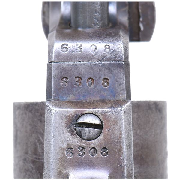 Cal. 31. S# 6308. Bbl. 5" octagon w/ brass front sight. Top flat is marked "ADDRESS COL. COLT / LONDON". Five shot round cyl. w/ stagecoach scene roll engraving. Bbl. & cyl. have British proof marks. Silver finished backstrap & large iron trigger guard. Blue finished bbl. & cyl. w/ case colored frame, loading lever & hammer. One piece walnut grip. UNATTACHED ACCESSORIES: original Colt casing. Lid exterior has brass nameplate. Lid interior has loading & cleaning instructions for Colt pistols. Blue felt fitted interior. Case contains powder flask, cleaning rod, two cavity mold, nipple wrench, Eley brothers cap tin & 8 round balls. Case exterior shows dents & handling marks w/ long crack in the lid. Case interior shows moderate wear. CONDITION: blue & case colored finish has faded to gray, showing small spots of scattered corrosion & light pitting. Backstrap retains 25% nickel finish. Trigger guard has traces of nickel in protected areas. Original grip finish shows light wear w/ scratches & marks. Sound mechanics. Bore retains sound rifling, showing spots of light pitting. (01-26492/DS). ANTIQUE. $3,000-4,000.