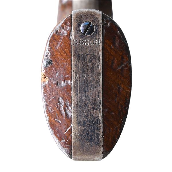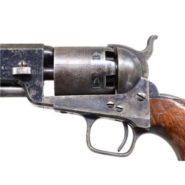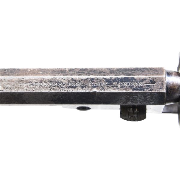 Cal. 36. S# 38308. Bbl. 7 1/2" octagon, top flat is marked "ADDRESS COL. COLT LONDON". Brass front bead. Six shot round cyl. w/ naval engagement scene roll engraving. Large iron trigger guard & backstrap. Blue finish w/ case colored frame, hammer & loading lever. One piece walnut grips. Serial number indicates 1854 mfg. UNATTACHED ACCESSORIES: proper wooden casing w/ blue velour fitted interior. Exterior lid has brass shield nameplate. Lid interior has directions for loading & cleaning Colt pistols. Case contains powder flask, oil bottle, two cavity mold, nipple wrench & Eley brothers cap tin. Case is in good original condition, showing exterior handling marks & grain checking. Interior shows light wear. CONDITION: bbl. retains 40% blue w/ balance flaking to gray. Cyl. & grip straps have largely faded to gray. Frame & loading lever retain over 50% lightly faded case colors. Grips have worn original finish showing numerous dents & handling marks w/ a small chip at butt of right panel. Sound action. Bright bore retains strong rifling. (01-26493/DS). ANTIQUE. $5,500-7,000.