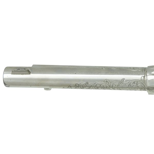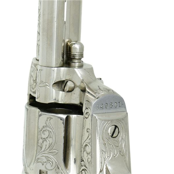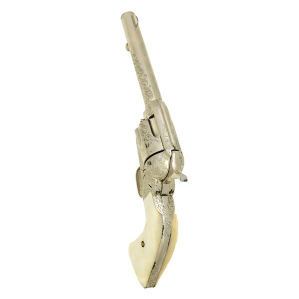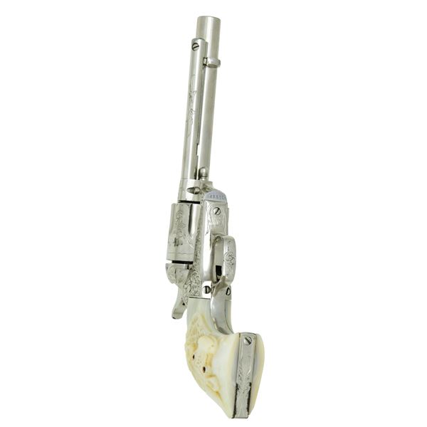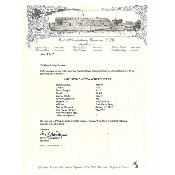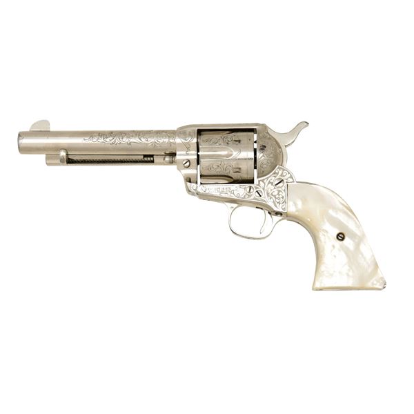 SHIPPED FACTORY GLAHN ENGRAVED COLT SAA WITH FACTORY LETTER. Cal. 45 Colt. S# 349801. Mfg 1927. Of the 357,859 first gen SAA revolvers, it is estimated that total production to be between 3,000-3,500 revolvers. Revolver appears to be engraved by factory Master Engraver Wilbur Glahn. Glahn's renowned "V" pattern appears at top of backstrap and bottom of grip frame. Frame, cyl. & bbl feature masterfully executed floral scroll engraving with ultra fine punch dot background. Rear of cyl has wavy line engraved border. Revolver is stocked with attractive mother of pearl grips; right panel has raised relief carved steer head with ruby eyes. Gun was shipped to Wolf & Klar of Fort Worth, TX in January of 1927. Wolf & Klar was considered one of the prominent purchasers of Colt revolvers, attracting wealthy businessmen, cattleman, outlaws & lawman from all parts of Texas and beyond. UNATTACHED ACCESSORIES: Colt Archive letter stating the following: "Serial Number: 349801/ Caliber: .45/c/ Barrel Length: 5 1/2"/ Finish: Nickel/ Type of stocks: Rubber/ Factory Engraved: Yes/ Shipped To: Wolf and Klar/ Address: Fort Worth, Texas/ Date of Shipment: January 12, 1927/ Colt Factory Order: #12291/1/ Number of same type guns in shipment: 1". CONDITION: very fine overall. Metal surfaces retain 95% original nickel with very small areas of flaked finish on edges of backstrap, along grip line at butt, rear edge of cyl. left recoil shield & left side of muzzle. Edges of frame & cyl. stops remain sharp & crisp. Very good grips. Left panel has small missing chip at heel. Bright bore with sharp rifling. Mechanically excellent. A difficult to find factory engraved Colt in high original condition. (24-2051/BH). CURIO. $27,500-37,500.