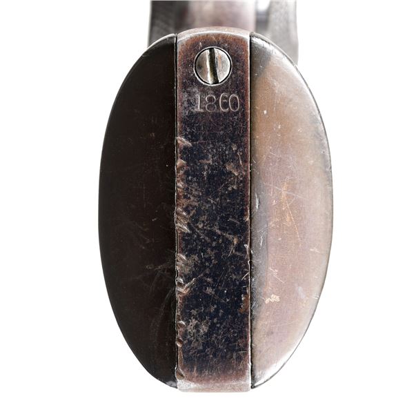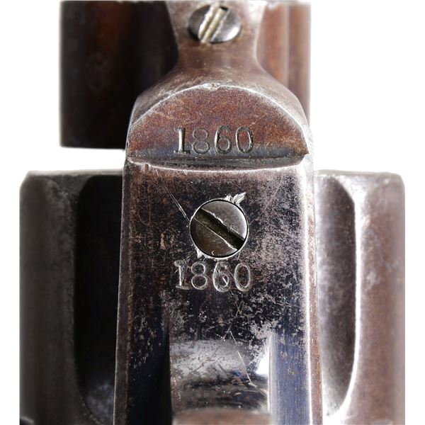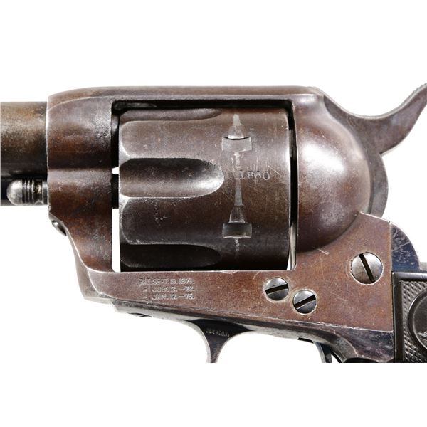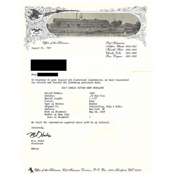 WITH FACTORY LETTER. EX FLAYDERMAN & RHOLES COLLECTIONS. Cal 22 RF. S# 1860. Bbl. 7 1/2" with correct short blade front sight. Beginning in 1875 Colt began production of the 44 RF SAA, however by this time centerfire cartridge performance had already far outpaced that of rimfire cartridges rendering SAAs chambered in 44 RF obsolete from the start and are found in the S# range 1-18XX. In an attempt to bolster sales, Colt then decided to manufacture or convert RF frames to a more desirable / saleable caliber, thus the introduction of the 22 RF to the Colt SAA line. The "solution" fell flat however and as stated in "A STUDY OF THE COLT SINGLE ACTION ARMY REVOLVER" by Graham, Kopec & Moore page 29, "In his research of Colt shipping records, John E Parsons accounted for 107 .22 caliber standard frame Single Actions. However a separation of converted .22's and regular .22 cal. production was not noted." With a meager 107 22 RF SAAs produced, this remains one of the rarest calibers in existence. Matching numbers appear on frame, cyl, grip frame & bbl. Left front of trigger guard bow marked "22 CAL" and does not appear to be an overstamp. Correct unnumbered 2 piece checkered hard rubber eagle grips. Bbl. has 1 line block letter address. Left side of frame marked with 3 line patent date. UNATTACHED ACCESSORIES: Colt factory archive letter to Norm Flayderman dated August 20, 1987 stating the following: "Serial Number: 1860/ Caliber: .22 Rim Fire/ Barrel Length: 7 1/2"/ Finish: Blue/ Type of Stocks: Rubber/ Shipped to: Schoverling, Daly & Gales/ Address: New York, NY/ Date of Shipment: May 28, 1889/ Number of Same Type Guns in Shipment: 1". CONDITION: Fine overall for RF production as few surviving examples retain any finish whatsoever. Metal components retain 20-30% original blue, notably in protected areas, butt & grip frame. Balance of metal turning gray with a pleasing brown patina. Action is also a blend of gray / patina with small areas of cleaned light pitting ahead of cyl. Hammer retains strong case colors. Grips show only light wear and fading commensurate with age. Very good bore retains strong rifling with areas of light frosting. Mechanically fine. PROVENANCE: Ex. Norm Flayderman Collection, Ex. Tommy Rholes Collection. James D. Julia past auction, March 2014. (01-25363/BH). ANTIQUE. $17,500-25,000.