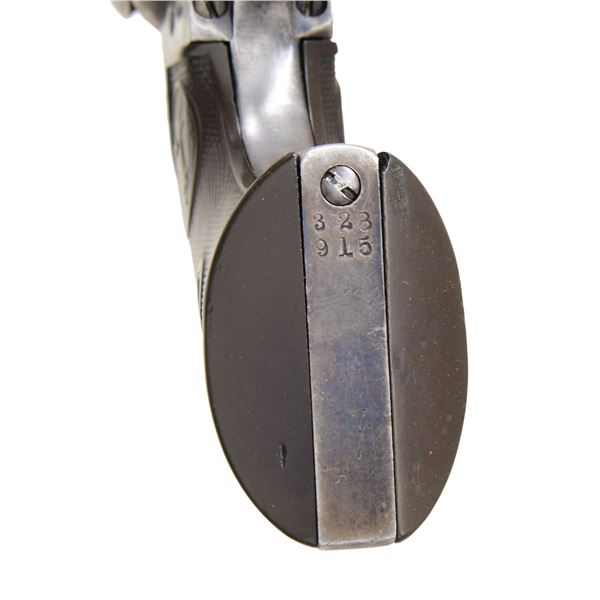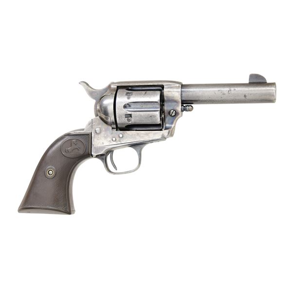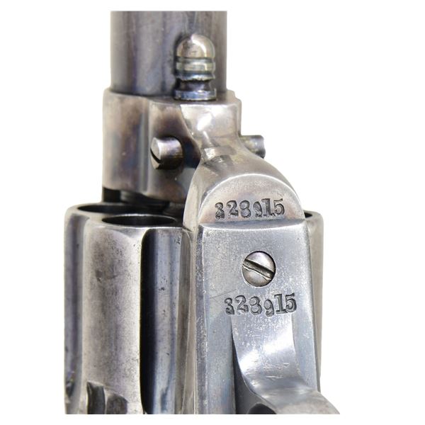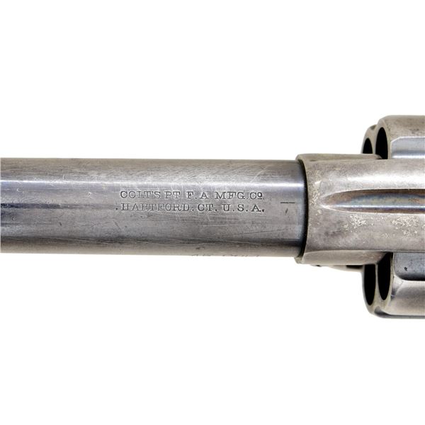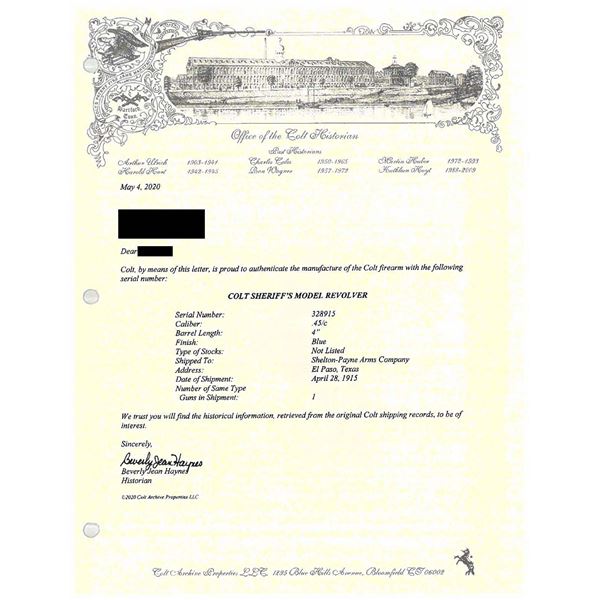 ARMY" VERY RARE COLT LONG FLUTE SHERIFF'S MODEL SAA REVOLVER. Cal. 45 Colt. S# 328915. Bbl. 4" w/o ejector. Six shot long flute cyl. Long flute cyls. remaining after the model 1878 double action was discontinued were altered for use in single action revolvers. The normal S# range for long flute use is 330,001 to 331,479. "A Study of the Colt Single Action Army Revolver" by Graham, Kopec & Moore lists 8 out of range known long flute revolvers on page 157-158. Among these is this revolver, no. 328915 listed as a 4" Sheriff's model, assembly completed April 27, 1915 & shipped April 28th, 1915. This revolver is also pictured on page 77 under the chapter pertaining to Sheriff's Models. Blue & case colored finish. 2 piece checkered hard rubber rampant colt grips. Frame & grip straps have matching S#s. Sheriff's model revolvers with long flute cyls. are practically unheard of. UNATTACHED ACCESSORIES: letter from Colt Archive Properties LLC detailing the following information, "Serial Number: 328915 / Caliber: .45/c / Barrel Length: 4" / Finish: Blue / Type of Stocks: Not Listed / Shipped To: Shelton-Payne Arms Company / Address: El Paso, Texas / Date of Shipment: April 28, 1915 / Number of Same Type Guns in Shipment: 1". CONDITION: bbl., cyl. & grip straps retain worn blue in protected areas, carry areas have faded to gray. Frame shows 30% visible case colors primarily on the right side & forward portions of frame w/ balance fading to gray from carry use. Grips have worn checkering w/ small chips at toe. Cyl. stops short of indexing when action is cycled. Bore retains strong rifling. (24-2052/DS). CURIO. $17,500-25,000.