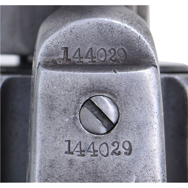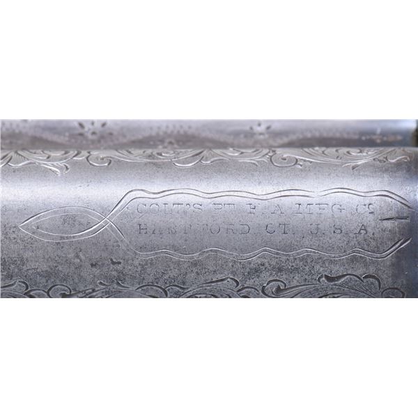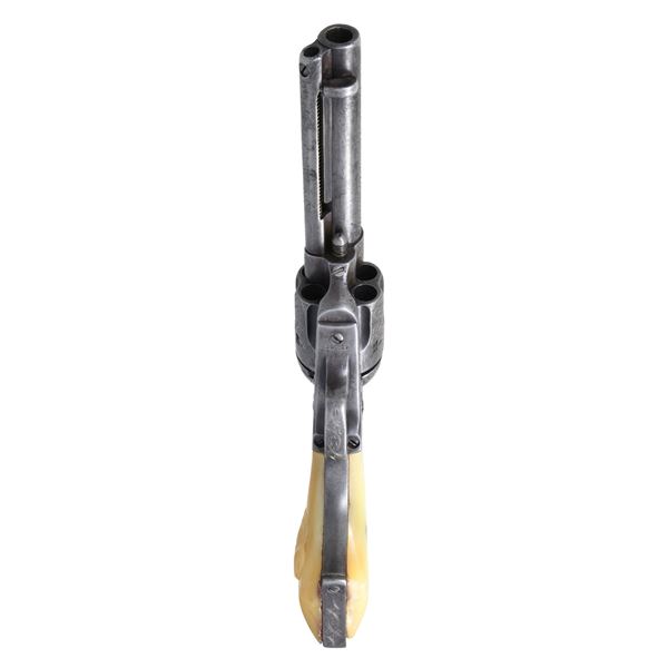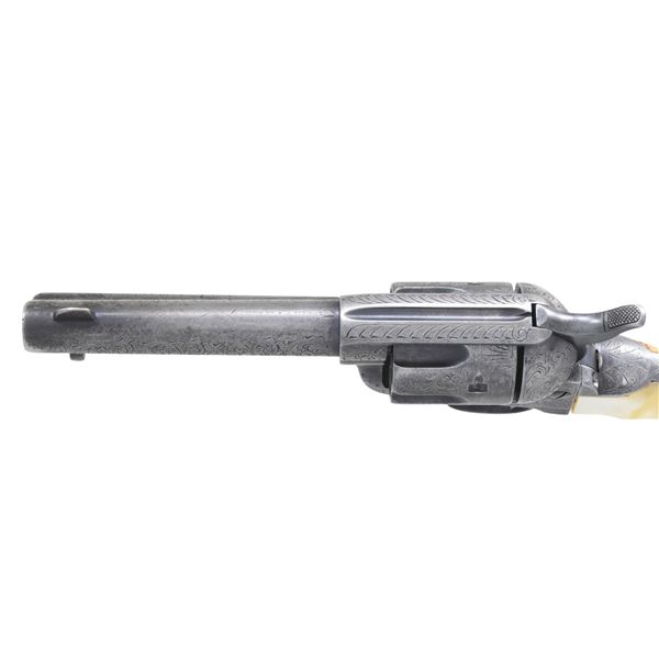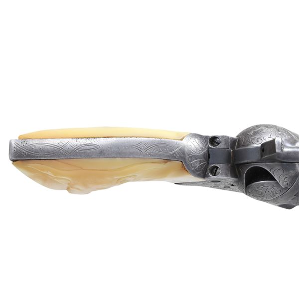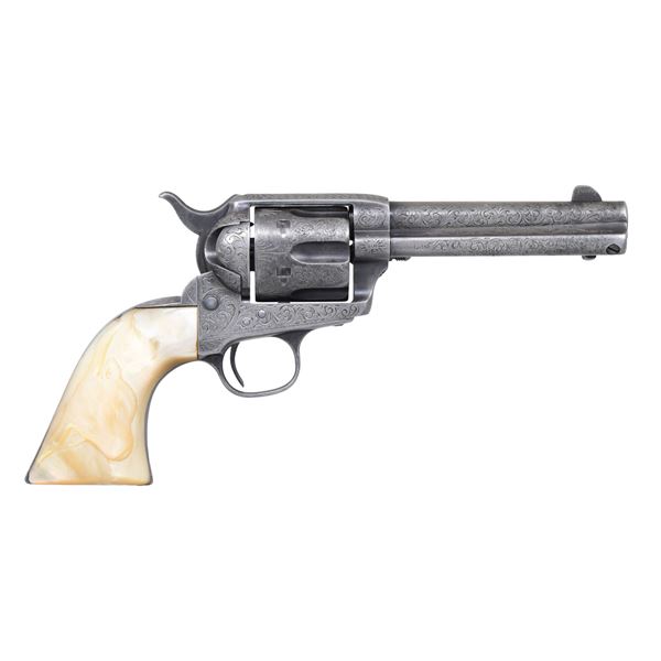 REVOLVER. Cal. 45 Colt. S# 144029. Bbl is 5 1/2". 6-shot fluted cyl. Frame, bbl, cyl, grip straps and ejector housing have nearly full coverage with vine type foliate scroll engraving with punch dot backgrounds. 2pc pearl grips. Right grip panel has a raised carved steer head. Manufacture date of 1892. CONDITION: metal has faded to gray showing spots of light corrosion. Grips show light age related staining and checking. Both panels are chipped at heel. Action is in time, cyl shows slight side play. Bore has lightly worn rifling. (01-26605/DS). ANTIQUE. $8,000-12,000