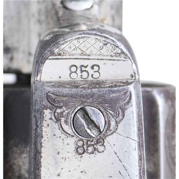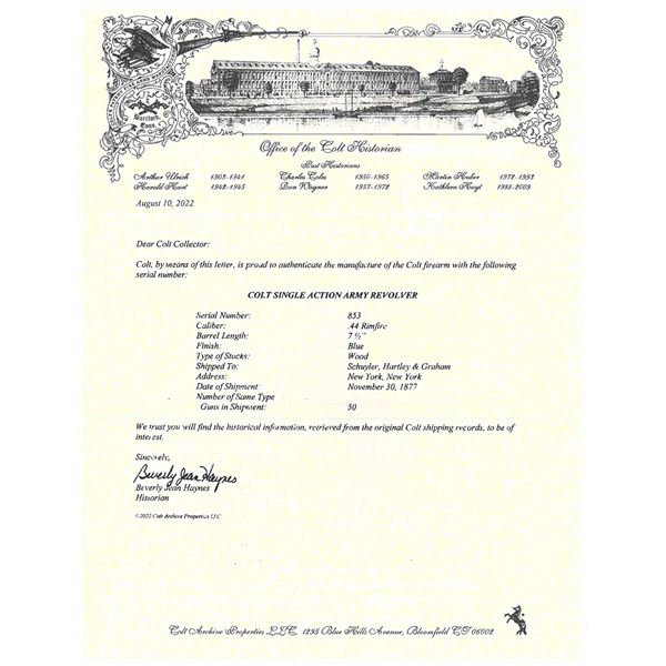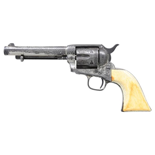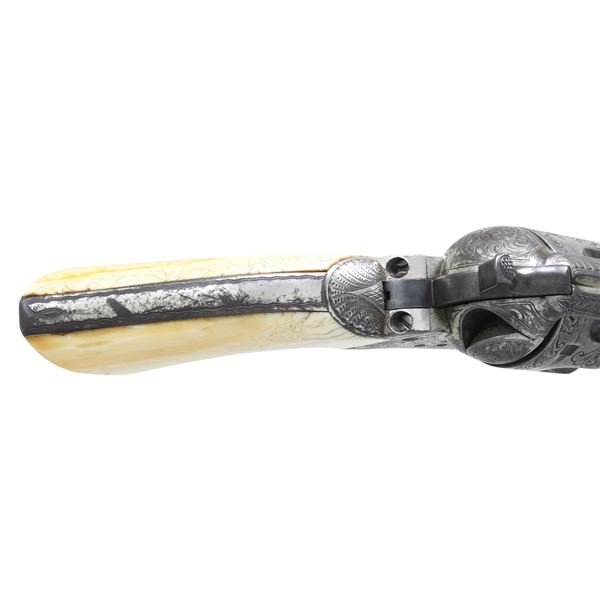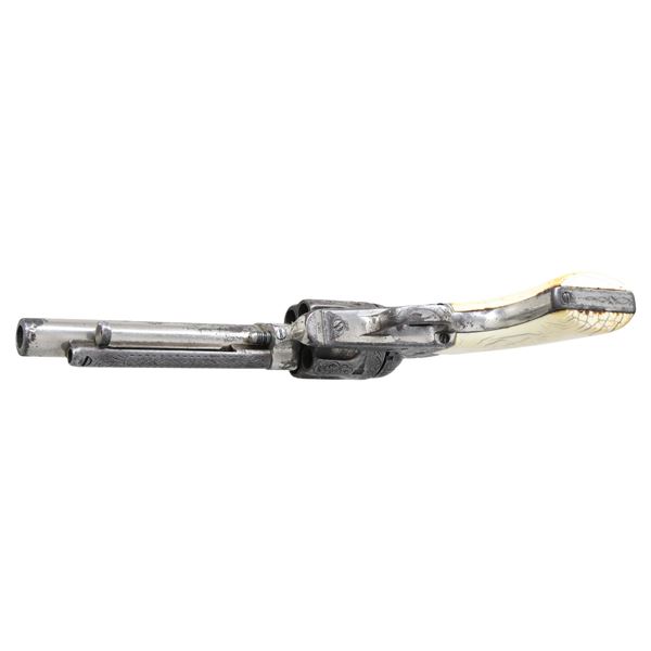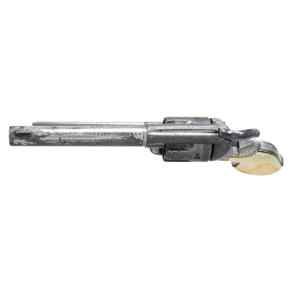 Cal. Originally 44RF, converted to 44CF. S# 853. Bbl is shortened to 5 1/2" w/ reattached blade front sight. 6-shot fluted cyl. Action, bbl, grip straps, and ejector housing has 75% vine type foliate scroll, New York style hand engraving. Engraving was likely done in the shop of Louis C. Nimschke. Full nickel finish. 1pc ivory grips. UNATTACHED ACCESSORIES: letter from Office of Colt Historian dated August 10, 2022 states Serial Number: 853 / Caliber: .44 Rimfire / Barrel Length: 7 1/2" / Finish: Blue / Type of Stocks: Wood / Shipped To: Schuyler, Hartley & Graham / Address: New York, New York / Date of Shipment: November 30, 1877 / Number of Same Type Guns in Shipment: 50. CONDITION: metal retains 30% nickel finish with balance fading to gray showing some very light pitting. Grips show age related cracking having acquired a partially yellowed color with small chips at toe. Action is in time showing slight cyl side play. Dark pitted bore has intact rifling. (01-26604/DS). ANTIQUE. $10,000-15,000.
