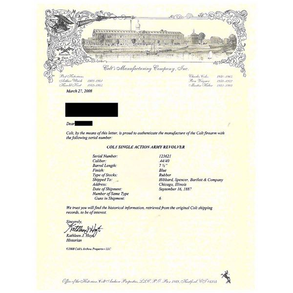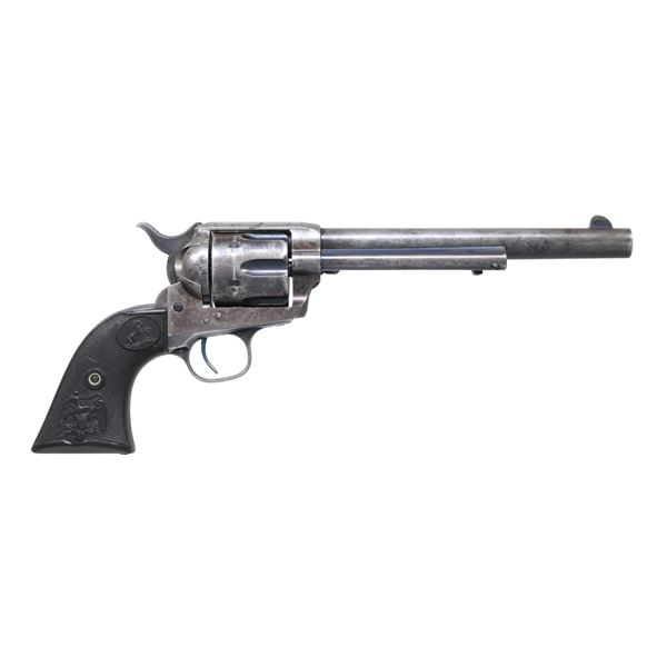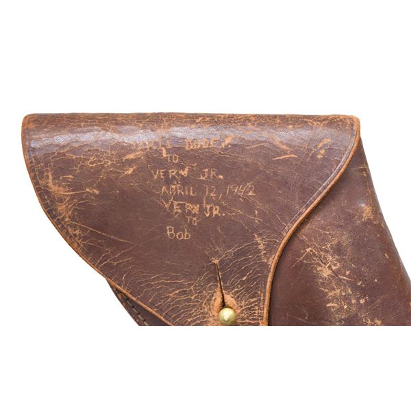Cal. 44-40. S# 123621. Bbl. 7 1/2" w/ Hartford address & faint etched "COLT FRONTIER SIX SHOOTER" panel. Blade front sight. 6 shot fluted cyl. Blue & case colored finish. Two piece checkered hard rubber eagle grips. UNATTACHED ACCESSORIES: Colt Archive Properties LLC letter, "Serial Number: 123621 / Caliber: .44/40 / Barrel Length: 7 1/2" / Finish: Blue / Type of Stocks: Rubber / Shipped To: Hibbard, Spencer, Bartlett & Company / Address: Chicago, Illinois / Date of Shipment: September 16, 1887 / Number of Same Type Guns in Shipment: 6". Also included is a leather flap holster. Belt loop is stamped "345 7 1/2". Flap has hand-carved markings "UNCLE DODE / TO / VERN JR. / APRIL 12TH, 1942 / VERN JR. / TO / BOB". Holster shows light wear. CONDITION: small amounts of blue & case colored finish remain in protected areas w/ balance fading to gray & showing spots of surface corrosion. Grips show light wear. Sound mechanics. Bore retains lightly worn rifling w/ spots of very light pitting. (01-26328/DS). ANTIQUE. $3,250-4,500.
