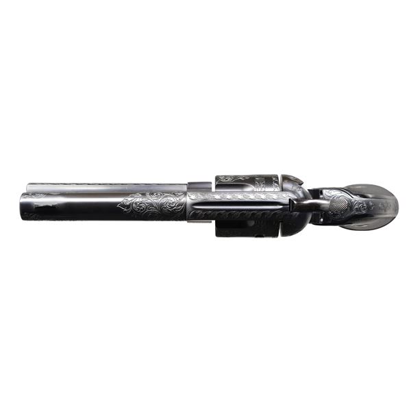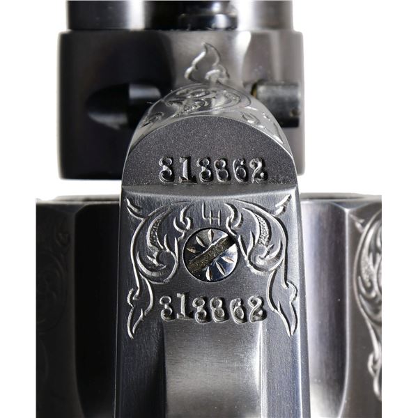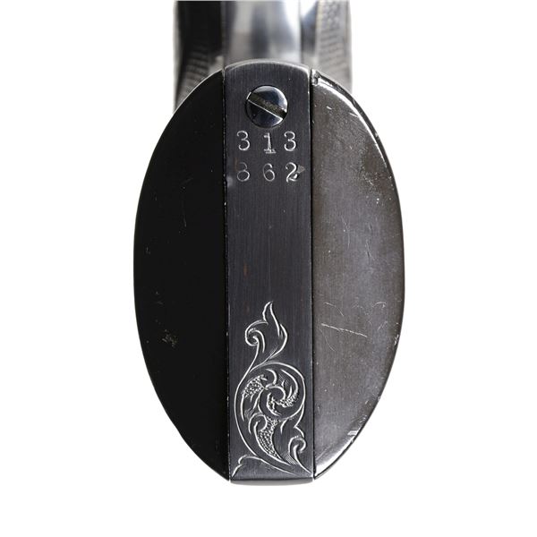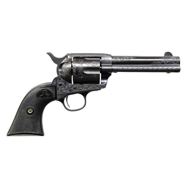 Cal 38 WCF. S# 313862 Mfg. 1910. Bbl. 4 3/4" with blade front sight. 6 Shot fluted cyl. Revolver features 25% floral scroll engraving with finely stippled background. Cob web engraving is found at either side of grip frame near grips. Signed at front bottom of grip frame what appears to be "LH" (unknown). Sides of hammer & trigger polished bright. Remainder of metal surfaces finished in a dark matte blue/black. 2 Piece checkered hard rubber grips with rampant Colts are numbered to gun on inside. CONDITION: near excellent as custom finished at time of engraving. Metal surfaces retain 98% plus finish. Very good grips have a few minor handling marks & small spots of flattening to diamonds. Bright, shiny bore with crisp rifling. (24-1826/BH). CURIO. $5,000-7,000.
