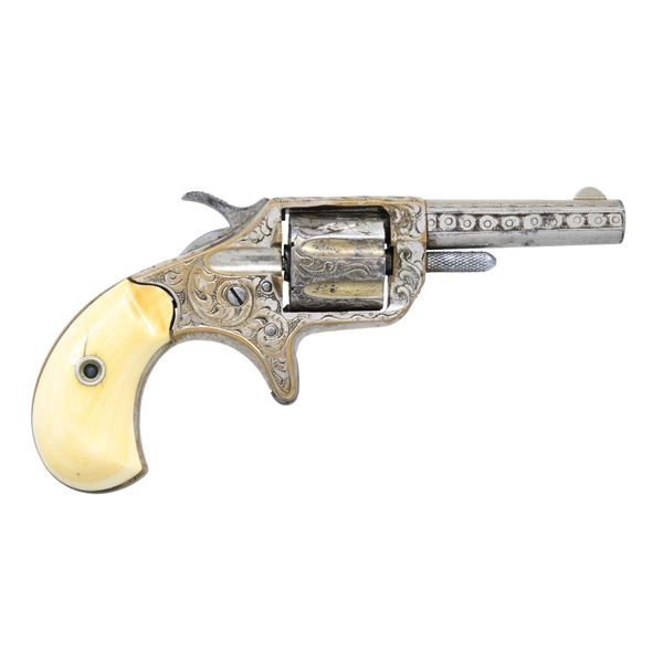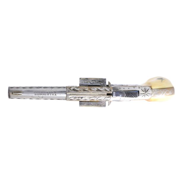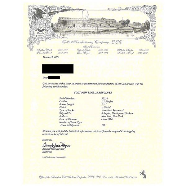 22 NEW LINE REVOLVER, 1876. Cal. 22. S# 30526. Factory letter matches this Colt New Line revolver with etched barrel "COLT NEW 22", 2.25" barrel, nickel plated, factory engraved, shipped in order of 182 guns to Schuyler, Harley, & Graham, NYC, 1876. Letter states half nickel, 2.25" barrel, lists grips as rosewood, but now has old ivory. UNATTACHED ACCESSORIES: Colt archives factory letter. CONDITION: fine overall, retains about 75% nickel plate, cylinder retains about 20% gold plate mostly in flutes, mechanically fine, good rifled bore, ivory grips are old Colt but not well fit. (01-26569/JS). $1,000-1,500.