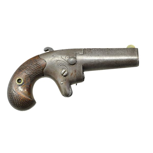 Cal. 41 RF. S# 6669. Bbl. 2 1/2". Single shot, fixed blade front sight, pivoting barrel with scroll engraved frame and checkered birds head walnut grips. Matching serial numbers on the frame and barrel. CONDITION: metal is primarily a gunmetal patina with scattered impact marks and dings but the markings remain clear. Grips show consistent wear with age, a few chips and dings. Bore is fair to good, strongly rifled but dark with some pitting and rust. (01-21798/CW) ANTIQUE. $300-500.