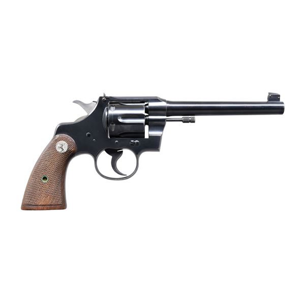 Cal. 22 LR. S# 4746. Bbl. 6" w/ adj. sights. Six shot round cyl. 2 piece checkered walnut grips w/ rampant colt medallions. Mfg. 1930. CONDITION: 90% blue showing light edge & muzzle wear. Grips show small handling marks. Very good bright bore. (24-5662/DS). CURIO. $800-1,200.