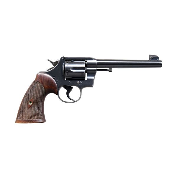 DA REVOLVER. Please note as of 5/6/25 this item description has been updated. Please revisit this description and contact us with any questions. Cal. 38 Special. S# 451948. Bbl. 6" heavyweight. Adj. front & rear sights. Six shot fluted cyl. Blue finish. 2 piece checkered walnut aftermarket target grips. CONDITION: over 90% blue showing edge & carry wear w/ cyl. drag line. Grips show light wear & marks. Sound mechanics. Very good bright bore. (24-6540/DS). CURIO. $800-1,200.