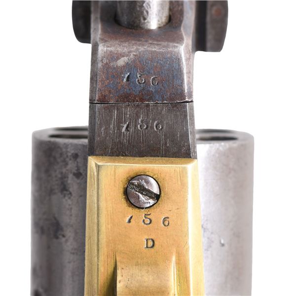 Standard configuration with 7.5" round barrel was made mid-1863. The barrel marking: "LEECH & RIGDON CSA" is stamped over casting flaws in top barrel flat. UNATTACHED ACCESSORIES: Current updated article on Leech & Rigdon revolvers. CONDITION: very good to fine overall, excellent by Confederate standards, all original and matching including screws. Markings all discernible, makers marking and "CSA" inspection on top barrel flat are partially obscured by casting flaws. Matching serial numbers all fairly crisp & discernible and found on barrel, frame, trigger guard, backstrap, cylinder, loading lever arm, wedge, loading lever catch, and arbor. Cryptic inspection marking "D" found rear of serial number ontrigger guard. Mechanically fine with sharp rifled bore. PROVENANCE: William E. Key collection, Oklahoma City, OK 1962; Karl Rommel, Lansing, Michigan collection, 1968; Jerry Fertitta; Jim Pounds collection ~2000. (01-26173/JS). ANTIQUE. $30,000-40,000.