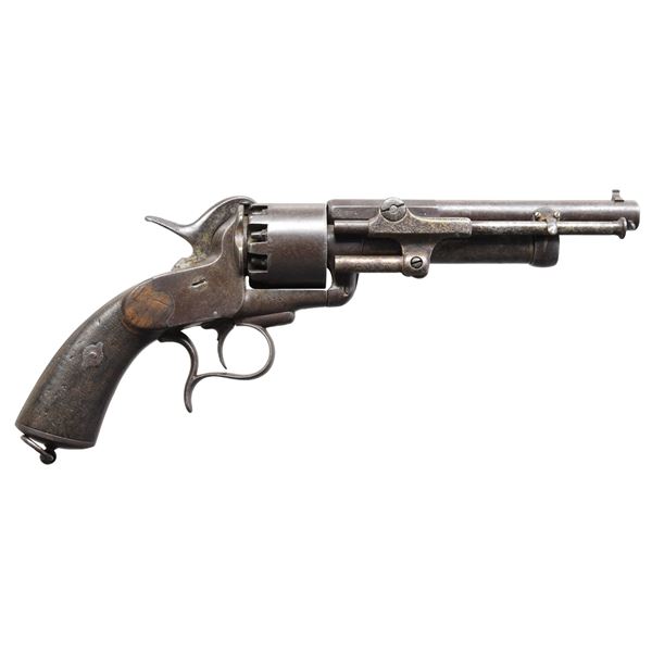 Standard configuration, 1st model finger loop trigger bow, swivel lanyard ring in butt cap, earliest spring loaded barrel to frame latch, 9-shot cylinder, underlying shotgun barrel, reciprocating pin cylinder rotation system, hinged selector on hammer face for choice of shotgun or cylinder, checkered wood grips, loading assembly attached to barrel on right side. Earliest engraved barrel address on 7" octagon to round barrel: "COL. LEMAT'S PATENT". This is an attractive rarely offered 1st model which saw use but is well preserved. UNATTACHED ACCESSORIES: letter of authenticity "Museum of Our Southern Heritage", 2005. CONDITION: good to very good overall. All matching S#s observed, loading arm appears to be old un-numbered well patinaed and matching replacement. Barrel address weak but all discerned, metal gray/brown uncleaned patina. Mechanics functionable, good rifled barrel & smooth shotgun bore. PROVENANCE: Lifelong collection of Richard A. Baumann. (01-26013/JS). ANTIQUE. $25,000-35,000.