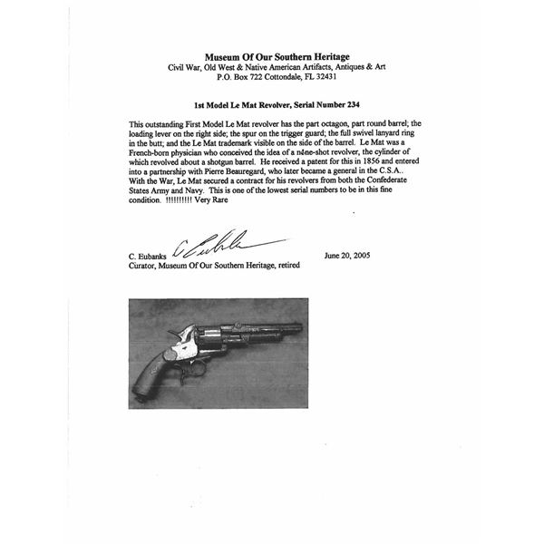 Cal. 42/18ga. S# 234. First model LeMats are very scarce with most identified historic revolvers of this configuration. Well known Confederates are often associated with these 1st models, PGT Beauregard being the best known. Several revolvers in this serial range were issued to Confederate Navy and several captured 1st models are known.