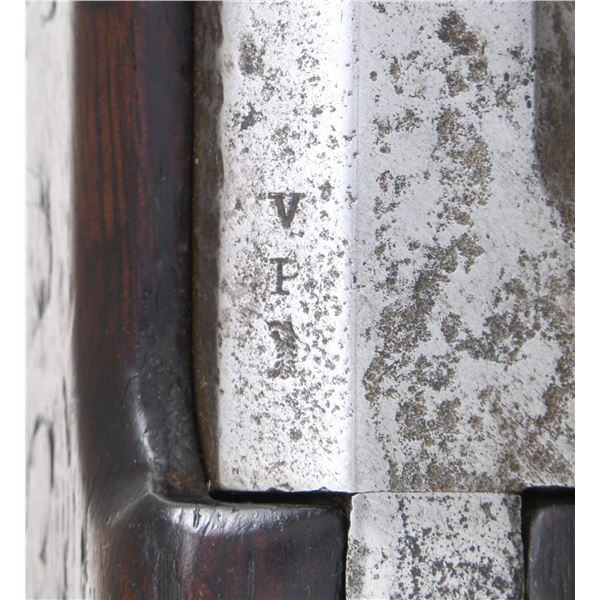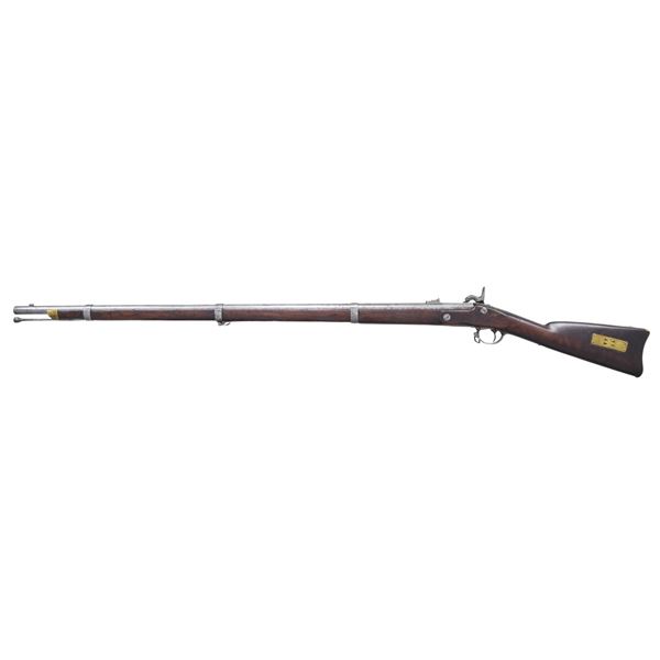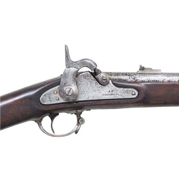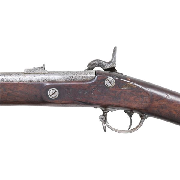 WITH INITIALS AND ASSOCIATED IDENTIFICATION. Cal. 58. NSN. Bbl. 40". Octagon to round bbl with a lug front sight and a rear folding sight. The left flat of the bbl is stamped "V" over "P" over "eagle head" and is known to have been captured from the Harper's Ferry Arsenal and remanufactured at the Confederate arsenal at Richmond, Virginia. The low-hump lock, as a result of the missing Maynard priming system, is stamped "C.S RICHMOND, VA" under the nipple and "1863" to the rear of the hammer. Upon inspection, under the lockplate the so called "Mule Shoe" is present and unaltered. Iron trigger guard, bbl bands stamped with a "U", sling swivels, and original ramrod with threaded end. Brass buttplate and nosecap. Solid stock with the letters "RRS" engraved opposite the lock, along with a light inscription that reads "L.MATTOZ". Oddly, there is a US enlisted man's brass belt keeper attached to the left side of the cheek with 6 brass nails. The initials "RRS" have yet to be identified, however they likely belong to a well-fought Confederate soldier who survived the war and whose gun was lost to Private Mattoz after the surrender. "L. MATTOZ" has been identified as Private L. Mattoz of Company L of the 57th Illinois Volunteers. Mattoz was held prisoner at Andersonville Prison but survived the war. We expect that this gun was likely picked up by Mattoz and returned with him to Illinois after hostilities ceased. UNATTACHED ACCESSORIES: a loose-leaf notebook with information about the gun, L. Mattoz, and the 57th Illinois Infantry. CONDITION: this gun appears in superb condition for a Confederate musket. The bbl and lock, as well as other iron parts, have a light gray patina with only the slightest hint of pitting. The brass has a beautiful aged patina. The wood has been professionally refinished and has a few minor epoxy repairs that only show with a black light. They are located at the front top of the bbl channel, on the underside of the stock in front of the trigger guard, to the right of the bbl tang, and around the first bbl ring. Very good bore with reasonably strong rifling. (01-26445/BF). ANTIQUE. $6,500-8,500.
