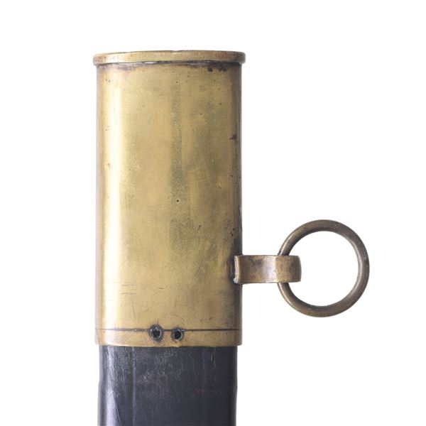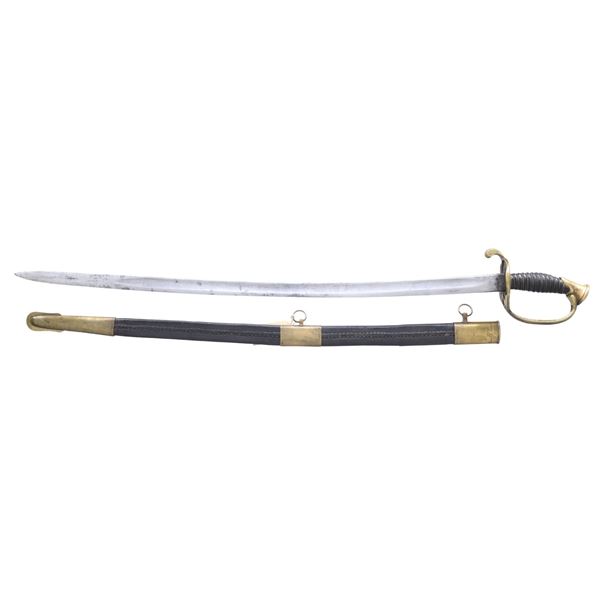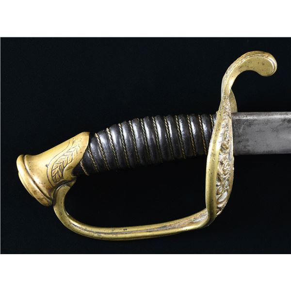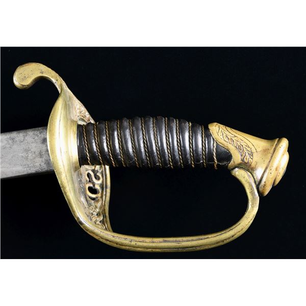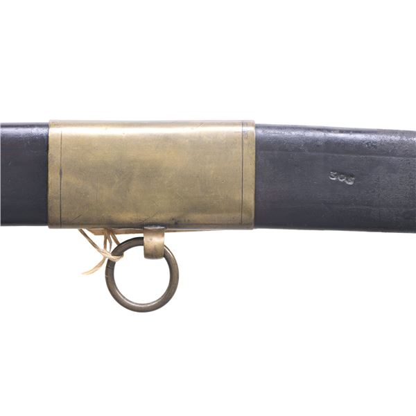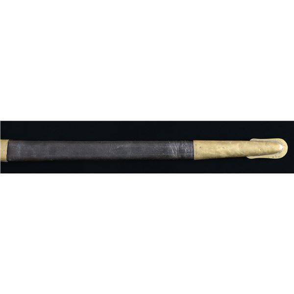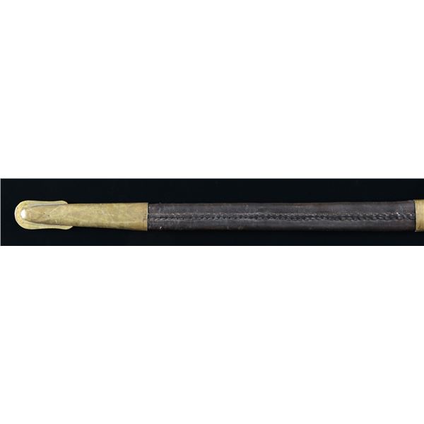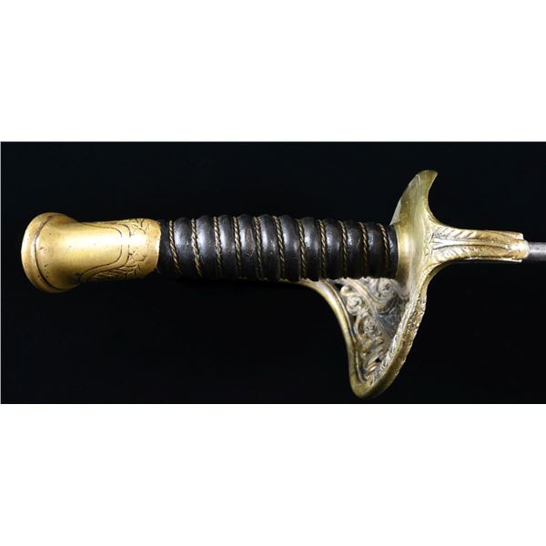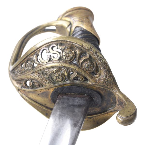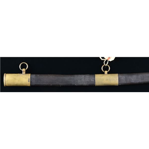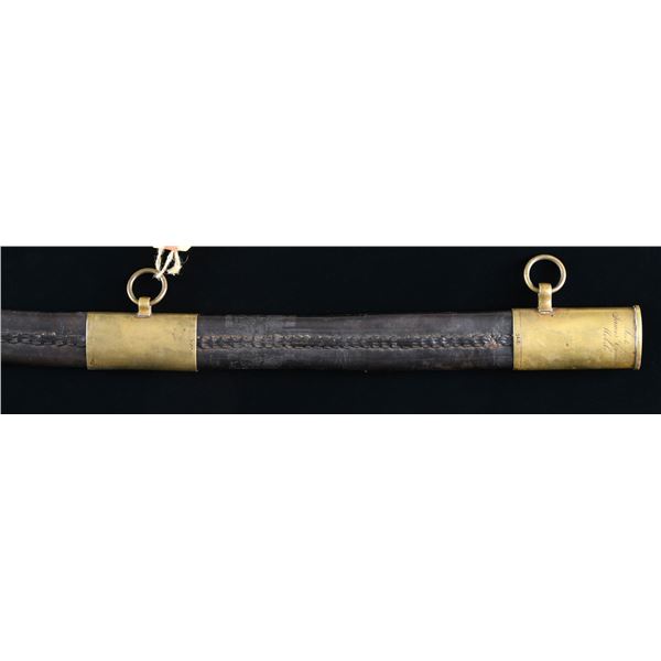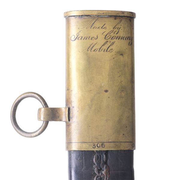 CAPT JOHN A. JACKSON, 38th ALABAMA. James Conning made beautiful Staff & Field officer's swords and this fine example has all the Conning characteristics: matching assembly/serial numbers "306" on blade, and scabbard. The hilt is Confederate copy of US model 1850 with "CS" pierced in floral guard. Original & correct Conning scabbard has braised posts to hold sword rings. Throat is inscribed "Made by / James Conning / Mobile".