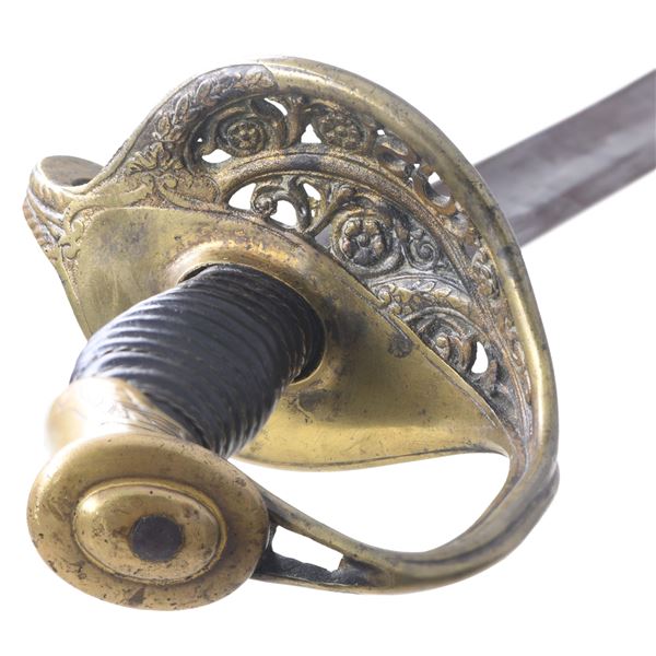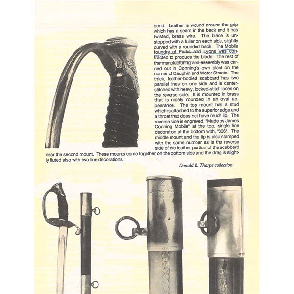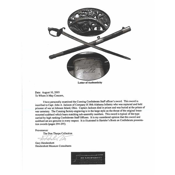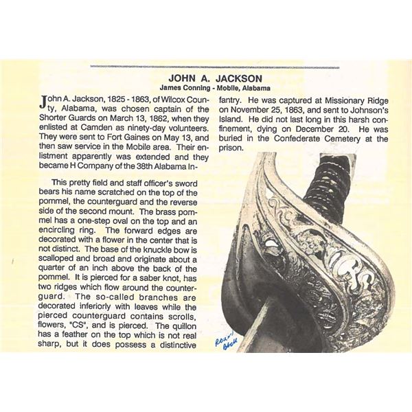 James A. Jackson (1825-1863) enlisted as captain with Shorter Guards of Wilcox county, Alabama. They were stationed at Fort Gaines, Mobile where sword was made, then becoming Co. H, 38th Alabama. Jackson was captured at Missionary Ridge November 25, 1863 sent to Johnson's Island Prison where he died less than month later. He is buried in prison cemetery where he died and incorrect middle initial is found on prison cemetery tombstone reads "JOHN P JACKSON / CAPT. CO H / 38TH ALA. INFY". UNATTACHED ACCESSORIES: File of research on Capt. Jackson and copies of correspondence concerning its provenance, letter of authenticity from Gary Hendershott, 2005. CONDITION: very good to fine overall, leather grip & wire complete, 31.5" blade is mostly bright with original polish, protective leather washer is still present. Scabbard is also very good to fine. PROVENANCE: Lifelong collection of Richard A. Baumann; Ex-collection Thomas J. McHugh; Don Tharpe collection; Gary Hendershott catalog 2005. (02-23356/JS). NON-GUN. $15,000-25,000.
