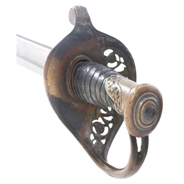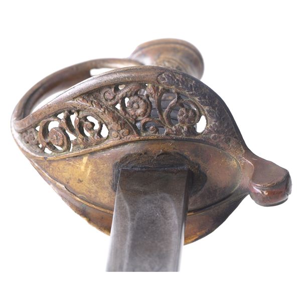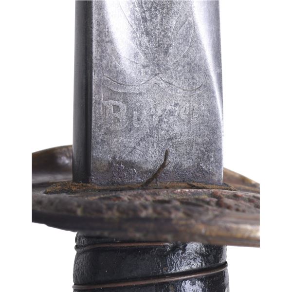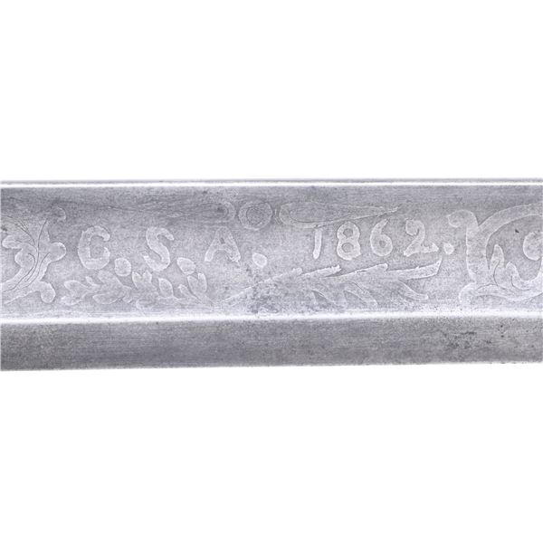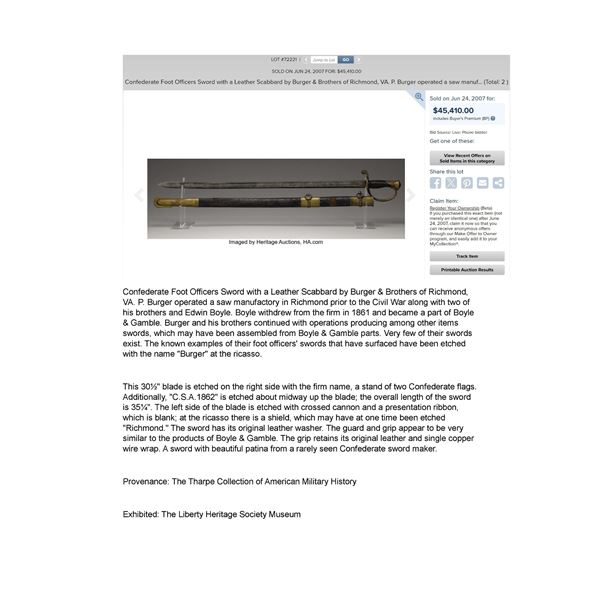 CONFEDERATE FOOT OFFICER'S SWORD. Among the very rarest of all Confederate maker marked swords are the handful of foot officer swords made with meaty heavy blades. This is an excellent survivor from the Don Tharpe collection. 30.5" unstopped fuller blade, etched in 15" panels on either side of the blade including patriotic motifs "C.S.A. 1862", crossed flags, and crossed cannon. "BURGER" is boldly etched on one ricasso. The brass hilt it's very reminiscent of products by Boyle & Gamble who Burger was partnered with prior to the war in the manufacture of tools and saws. CONDITION: very good to fine overall, blade is smooth gray, easily read etched panels, grip retains almost all of its original leather and all of its patented copper wire wrap. The hilt has a rich brass patina. The accompanying brass mounted leather scabbard fits well and though not a product of the manufacturer has been with sword since it's known collection history. Sword also retains its original protective washer. PROVENANCE: Lifelong collection of Richard A. Baumann; Don Tharpe collection; Liberty Heritage Society Museum; Heritage Auctions lot 72221 June 24th 2007. (02-23359/JS). NON-GUN. $15,000-25,000.