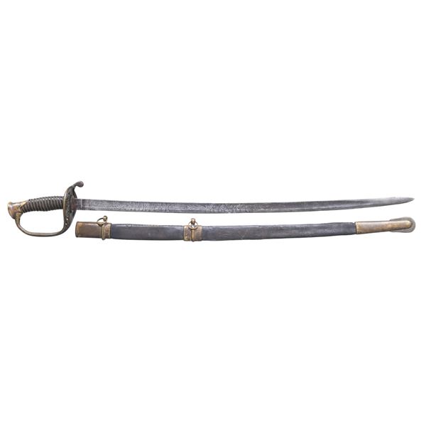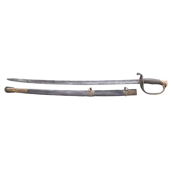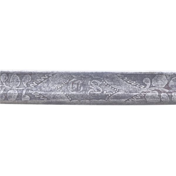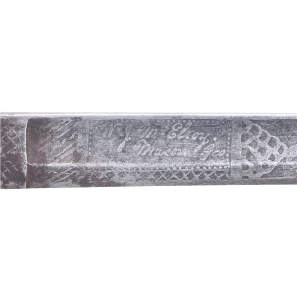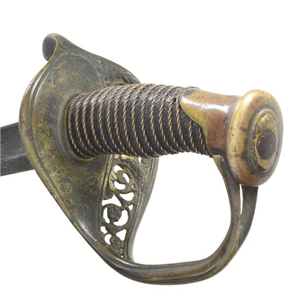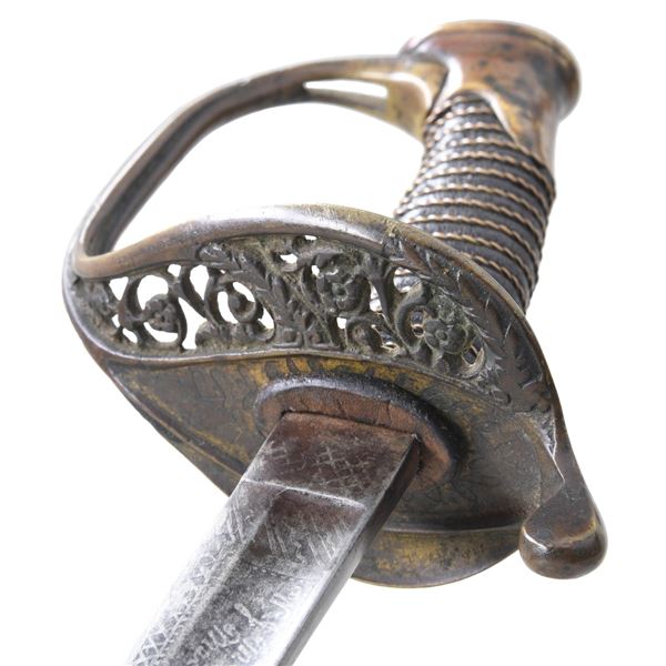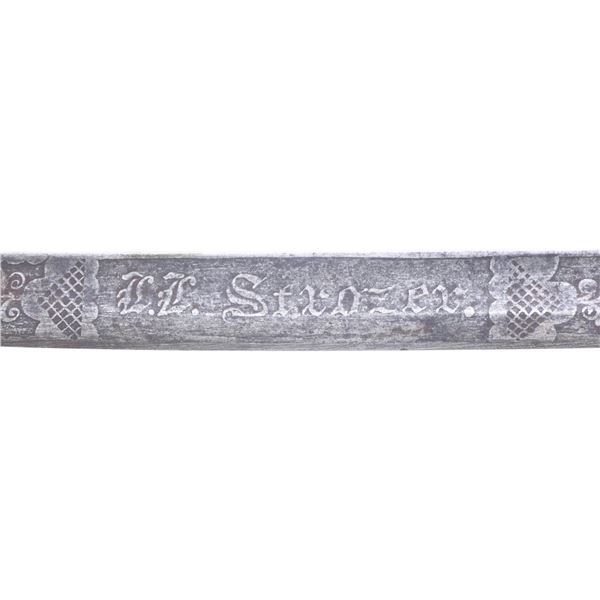 OFFICER'S SWORD, ASST. SURGEON LL STROZER, 4th GEORGIA INFANTRY. Classic McElroy foot sword, 29" blade with square stopped fuller, unique McElroy whimsical blade etch using decorated windows around panels, script CS, crossed flags, "L.L. STROZER" in same old German script. "W. J. McElroy / Macon Ga" is etched forward of one ricasso. Hilt is one variant used by McElroy being his copy of the US pattern 1850, but with plain undecorated pommel and quillon. Unique to McElroy is the added etched (not cast or engraved) floral decoration on top & bottom of hilt, and pommel. The original McElroy scabbard has pinned brass mounts with thin sword rings characteristic to Macon made swords. Lucurgus L. Strozer (1836-) and brother Cyrus S. Strozer both enlisted in Albany Georgia into Company E, 4th Georgia infantry of famous Dole-Cook Brigade. Brother Cyrus was badly wounded, shot in elbow May 13, 1864. I wonder if his physician brother who carried this sword treated him? Lycurgus served through most of war in Virginia with his brother, but after being listed as present at Camp Rodes, near Petersburg January 4, 1865, he then appears on rolls as asst. surgeon for Engineer Corps Macon GA March 4, 1865. After the war, he continued practicing medicine in Albany GA, listed as druggist in Albany census, 1870. It is difficult to find McElroy swords with their original leather scabbards and all three matching mounts like this one. CONDITION: very good overall, blade is grey with good discernible etch, original protective washer is intact. Grip is fine with complete leather and twisted wire wrap, one small piece of leather is chipped but still attached. Brass hilt and scabbard mounts have matching dark mottled patina with strong traces of gold plate. Scabbard is sound and solid, crazed, dry, glued repair between bottom mounts, fits sword tightly. PROVENANCE: Lifelong collection of Richard A. Baumann. (02-23361/JS). NON-GUN. $15,000-20,000.