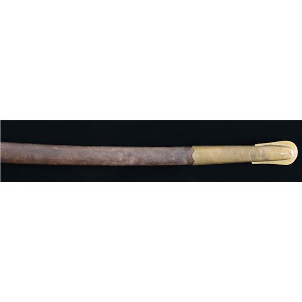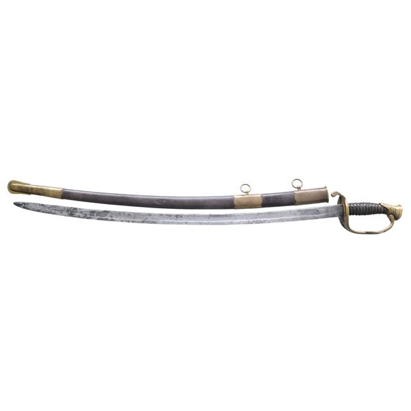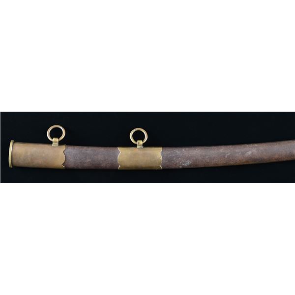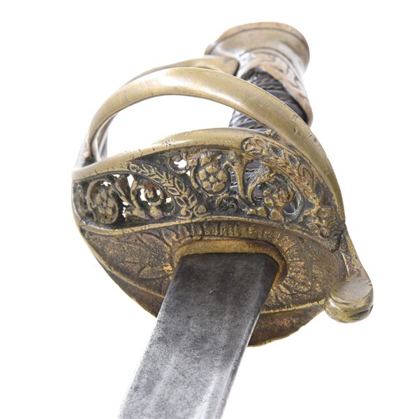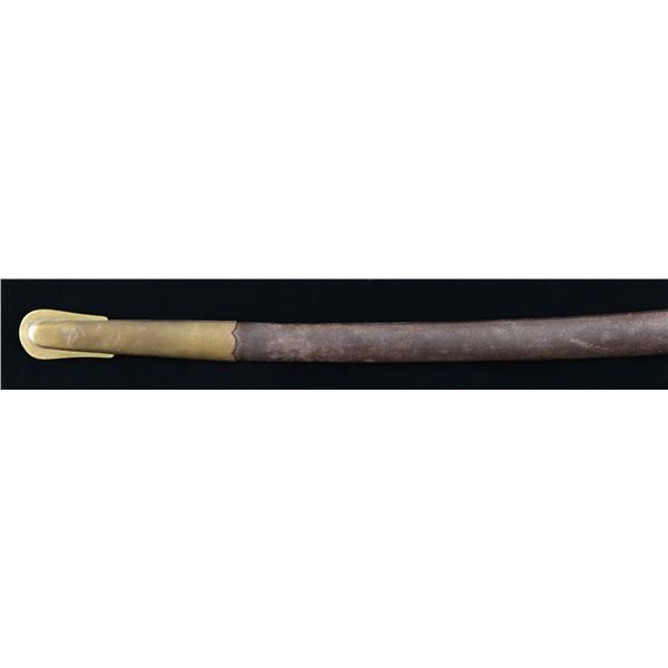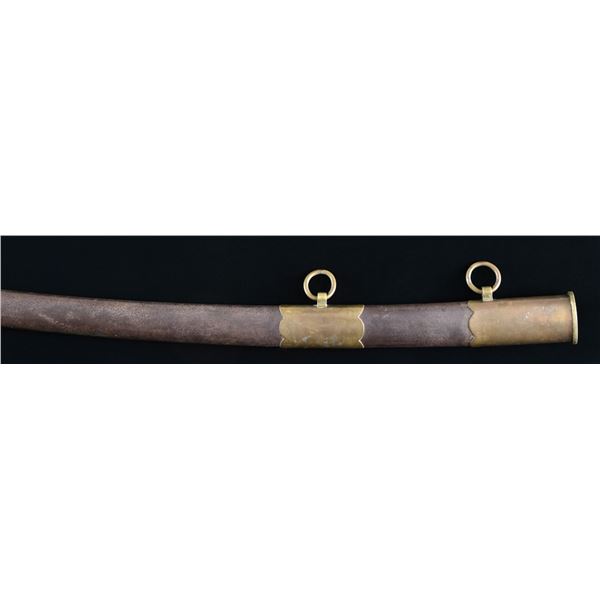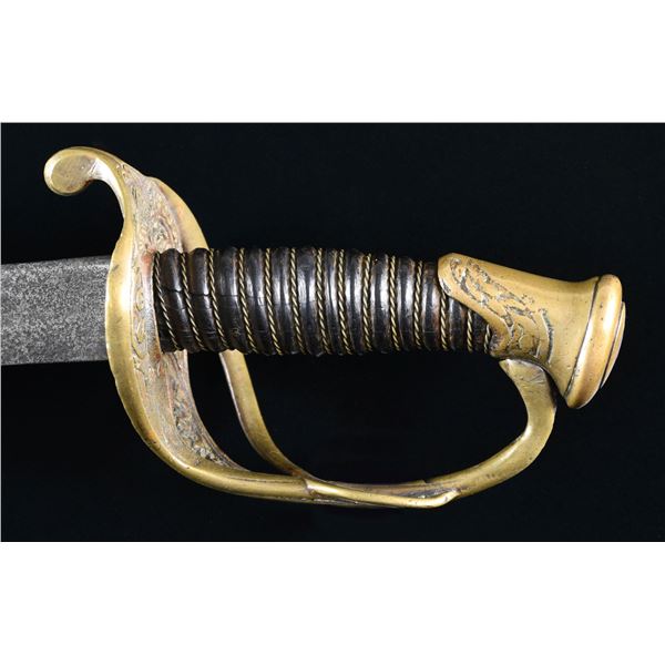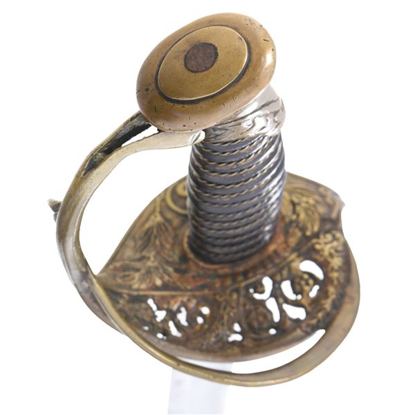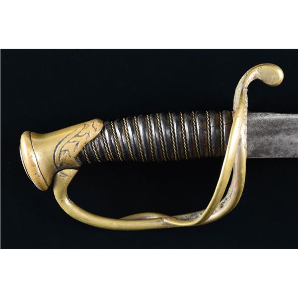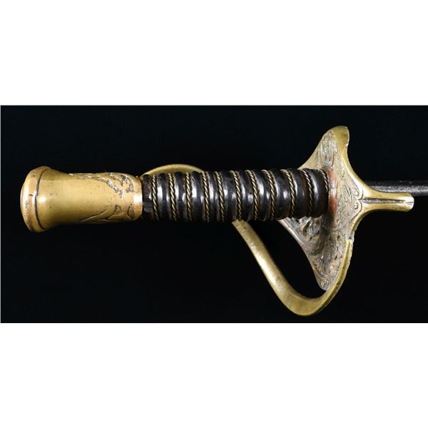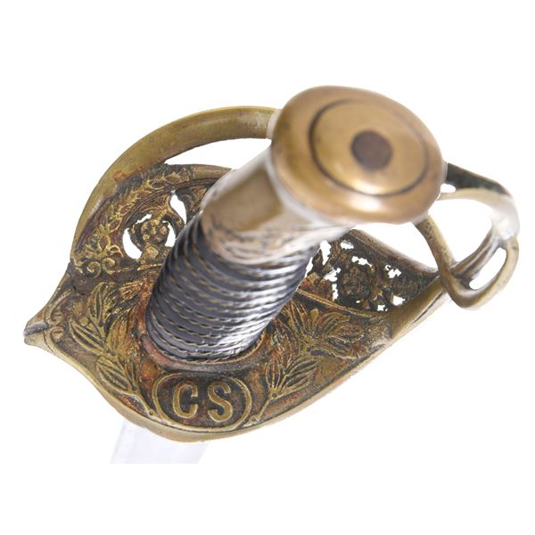 SWORD. Only a handful of this pattern are known, made in deep south, probably by Louis Bissonnet in Mobile, but often attributed to Leech & Rigdon. The original Confederate brass mounted iron scabbard has figured mounts found on other known Leech swords & sabers. Hilt exhibits a relief cast "CS" in oval frame on top of guard with an extra added branch found on a few inscribed swords with extra polish and finish like this example. The blade etch is heavily worn and presentation is not discernible. UNATTACHED ACCESSORIES: copy of Heritage Auctions, results & description from Don Tharpe collection, lot 72247, Dec. 1, 2007. CONDITION: very good overall, hilt, grip, and scabbard are fine, good patina, polished wood grip retains most of its black dyed surface with tightly wrapped original twisted brass wire. 30" blade is cleaned, pitted, with discernable traces of whimsical etching characteristic to Louis Bissonnet. Similar swords are known presented to generals and other high rank officers. PROVENANCE: Lifelong collection of Richard A. Baumann. (02-23363/JS). NON-GUN. $12,000-20,000.
