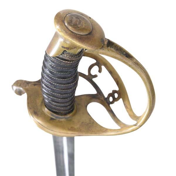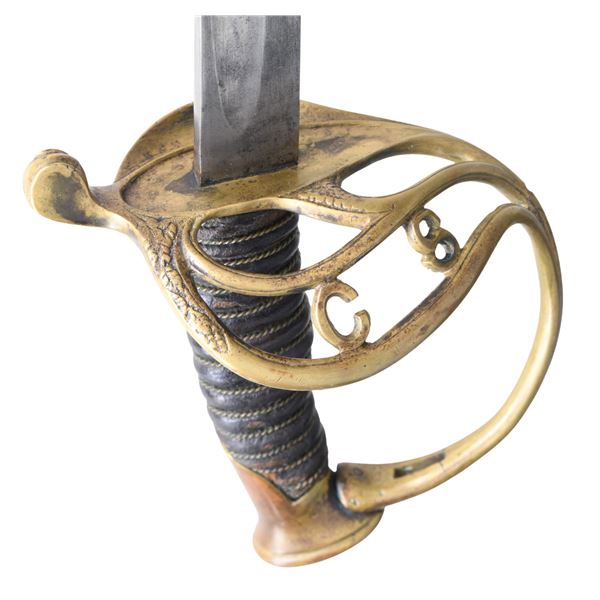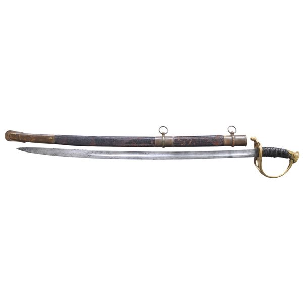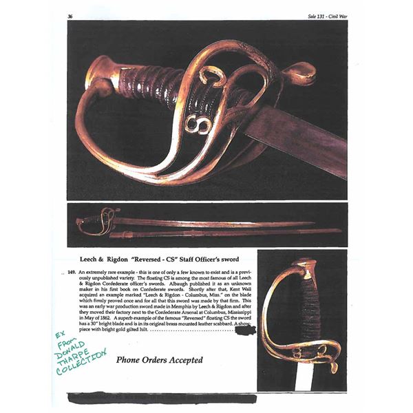 SWORD MADE BY THOMAS LEECH, MEMPHIS, TN. 30" meaty, .32" thick unfullered blade, "CS" cast into decorated branched hilt, classic Leech undecorated sculpted pommel cap. Bill Albaugh in his early iconic texts made no attribution as to maker of this unique pattern. Recent scholarship attributes this sword to Thomas Leech & Co who produced swords in Memphis, Tennessee then later in partnership with Charles Rigdon in Columbus, Mississippi and lastly in Greensboro, Georgia. This sword has characteristics of the earliest Thomas Leech Memphis Novelty Works swords & bowie knives with cord wrapped grip which is not seen on his swords after 1862. Leech made two variants of this sword, with the orientation of the "floating CS" the most discernible difference. This sword is nearly identical to the sword carried by Confederate General "Jo" Shelby, and is shown as Figure 31D in Albaugh's "Photographic Supplement of Confederate Swords". The accompanying scabbard fits very well protecting blade which still has some original polish & luster. This is a beautiful survivor in fine overall condition. UNATTACHED ACCESSORIES: copy of page from Gary Hendershott catalog #131, 2005 when sold to consignor, "ex-Donald Tharpe Collection". CONDITION: very good overall, blade is superior & smooth gray/white with staining. Hilt & scabbard mounts have similar brass patina, small unnoticed crack in knucklebow unaffecting aesthetic. Grip has complete leather & twisted wire wrap with a few small areas of exposed cord from leather wear. The accompanying scabbard is brass mounted and fits well. The scabbard is not a product of Leech but is in matching condition and blade must have been in scabbard most of its life as better than most survivors. PROVENANCE: Lifelong collection of Richard A. Baumann. (02-23354/JS). NON-GUN. $12,000-16,000.
