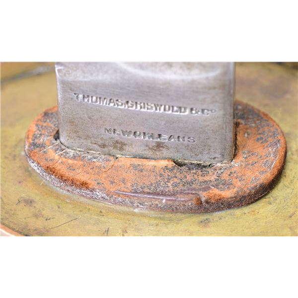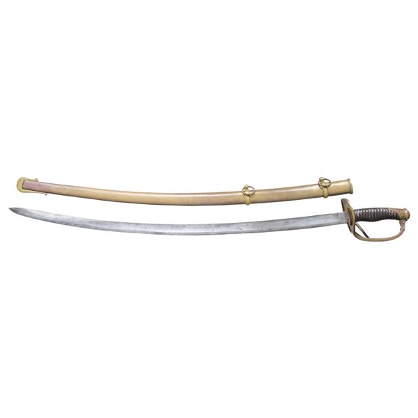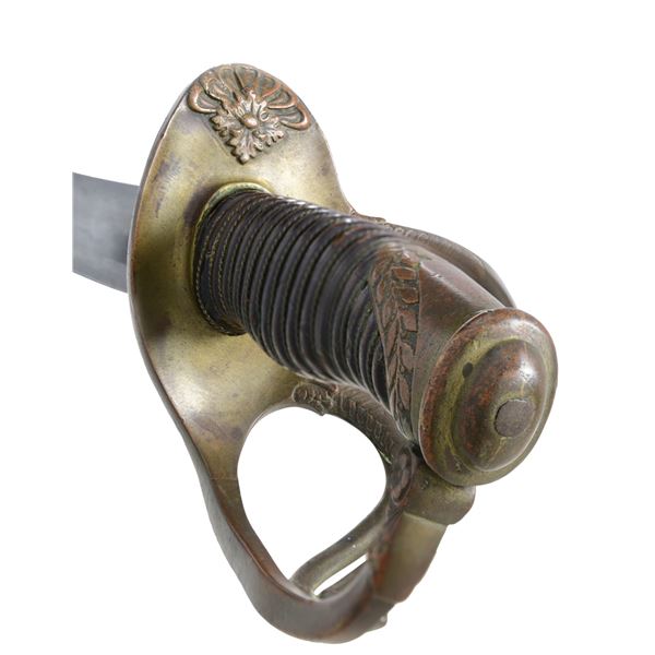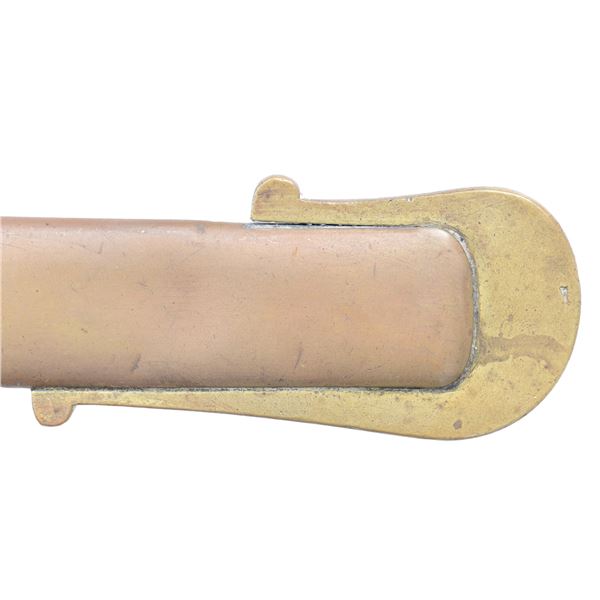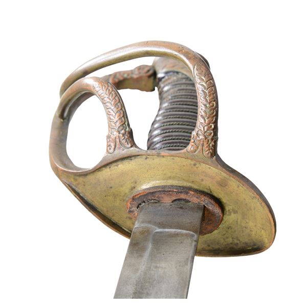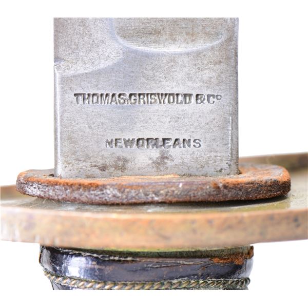 OFFICER'S SABER WITH RAREST MAKER MARK. Thomas, Griswold & Company made the finest quality swords in the Confederacy. The address stamped on ricasso is rarely seen in two straight lines: "THOMAS GRISWOLD & CO., NEW ORLEANS". This cavalry officer's saber as many of their products, had their signature solid brass scabbard. These swords were so popular in their day that several Confederate Generals carried them and even one Union General was known to have carried one that he must have captured at some campaign during the war. It would be difficult to upgrade this fine example especially with rare full firm straight line address. CONDITION: 35.5" blade is fine & overall gray/bright, uncleaned with scattered light staining, very good point. Maker's mark is crisp. Grip retains most all its original high polish brown leather, few small chips & scuffs, complete tight twisted wire wrap. Original protective leather washer is solid. Brass hilt and scabbard have fine matching dark mustard colored patinas. Well fit scabbard body has few light dents unaffecting the overall aesthetic. PROVENANCE: ex-Dr. Joseph Murphy collection. (02-23610/JS). $10,000-12,000.
