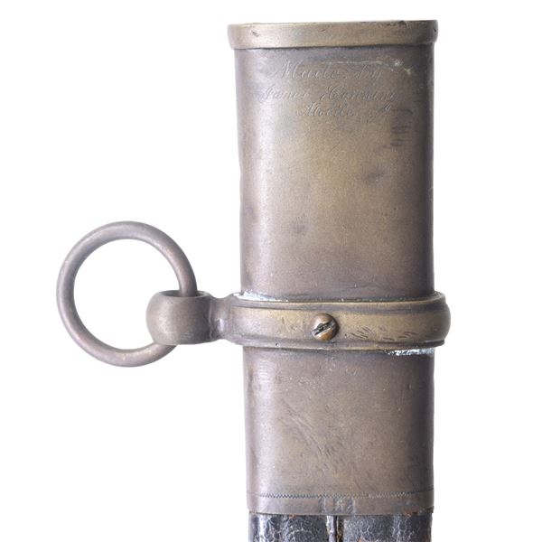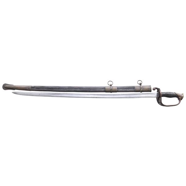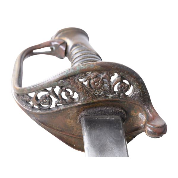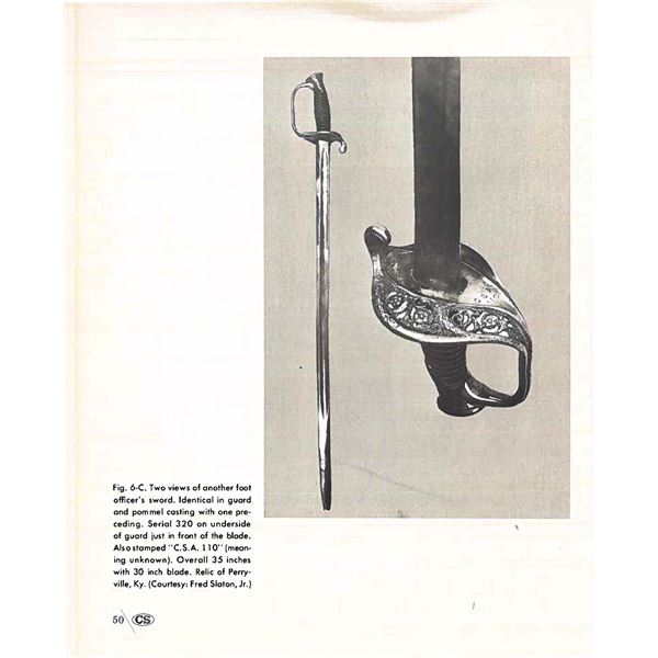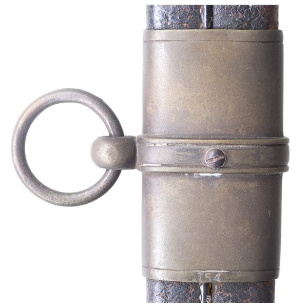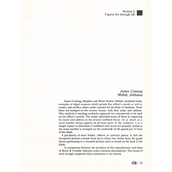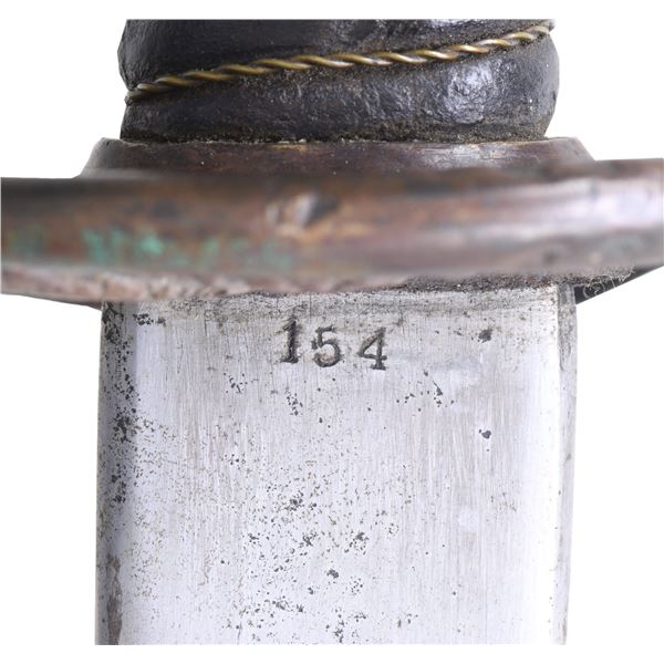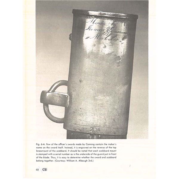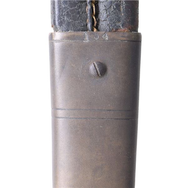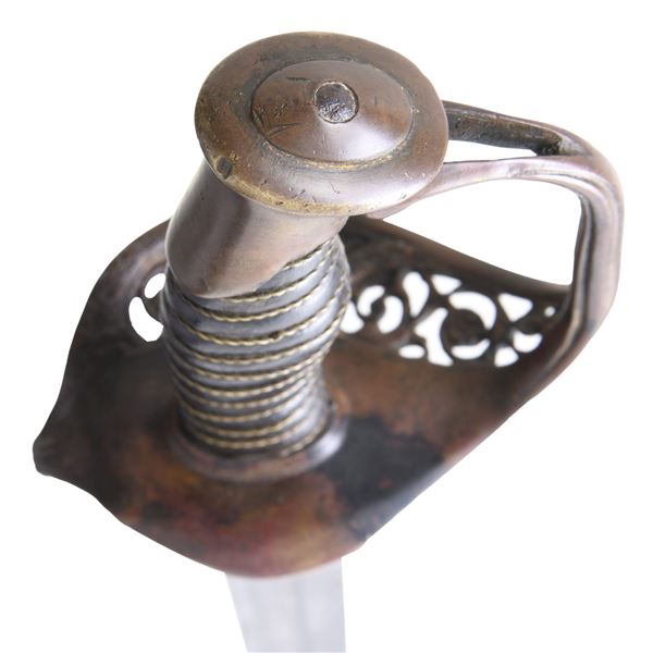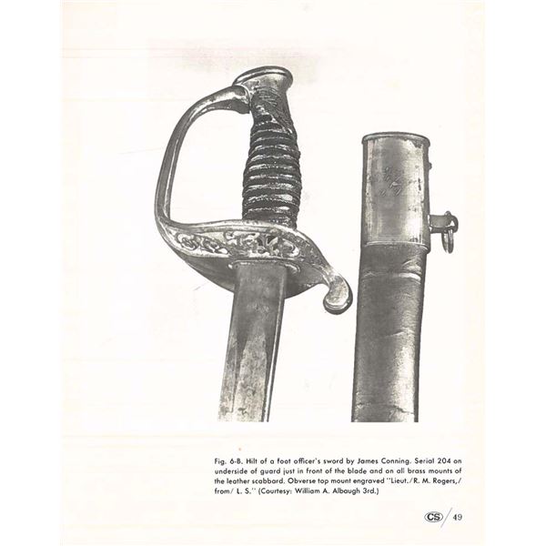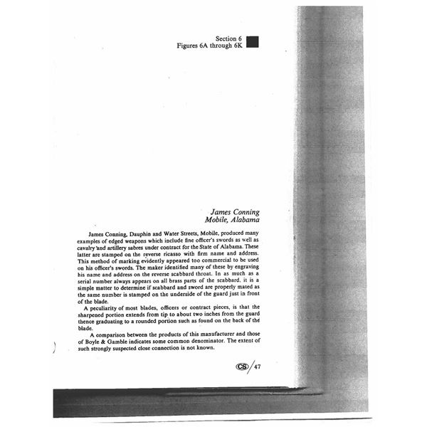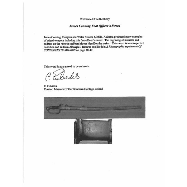 Classic James Conning foot sword with matching numbered blade & hilt. Scabbard is script engraved on throat "Made by / James Conning / Mobile" and each mount is numbered 154 like hilt and blade. The scabbard style is not typically attributed to Conning, but appears to be original and correct for this sword. UNATTACHED ACCESSORIES: letter of authenticity from Museum of our Southern Heritage, & copy of pages from Albaugh's "Photographic Supplement to Confederate Swords" concerning this manufacturer. CONDITION: very good overall, blade has been cleaned with staining and light pitting. Grip very good to fine with complete leather and twisted wire wrap. Traces of gold plate are found on protected portions of hilt with balance dark olive/mustard patina. Scabbard mounts have similar matching patina. PROVENANCE: Lifelong collection of Richard A. Baumann. (02-23348/JS). NON-GUN. $7,000-9,000.
