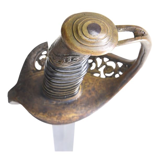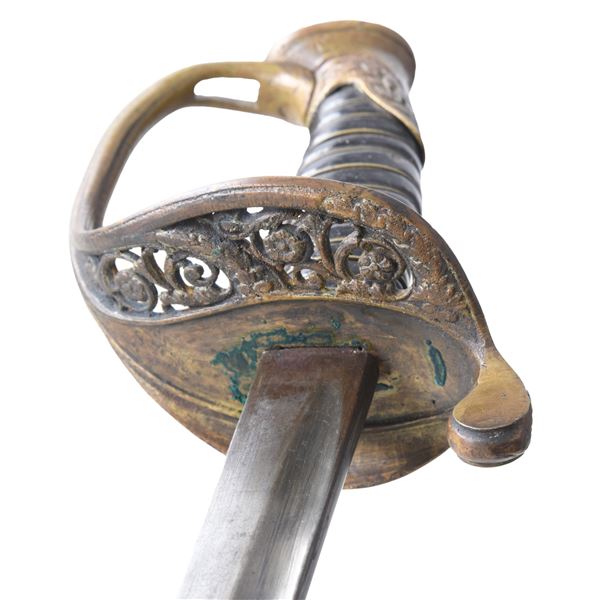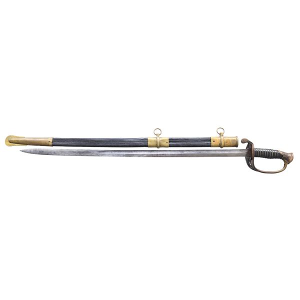SWORD. 29" unstopped fuller blade, 1850 B&G style hilt with high copper content giving reddish patina to distinctive hilt with plain undecorated sides to quillon. Grip is polished black leather with single brass wire wrap. CONDITION: sword overall is fine, blade is smooth, gray, with a few nicks in cutting edge, good point. Hilt like blade is uncleaned with mottled patina, grip is near perfect with only a couple small chips in surface. The accompanying scabbard fits sword well and is in matching very good to fine condition but is not a product of Boyle & Gamble, protective washer has been added. PROVENANCE: Lifelong collection of Richard A. Baumann. (02-23350/JS). NON-GUN. $3,000-6,000.