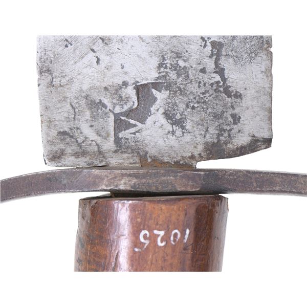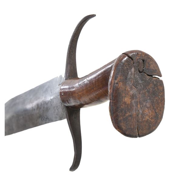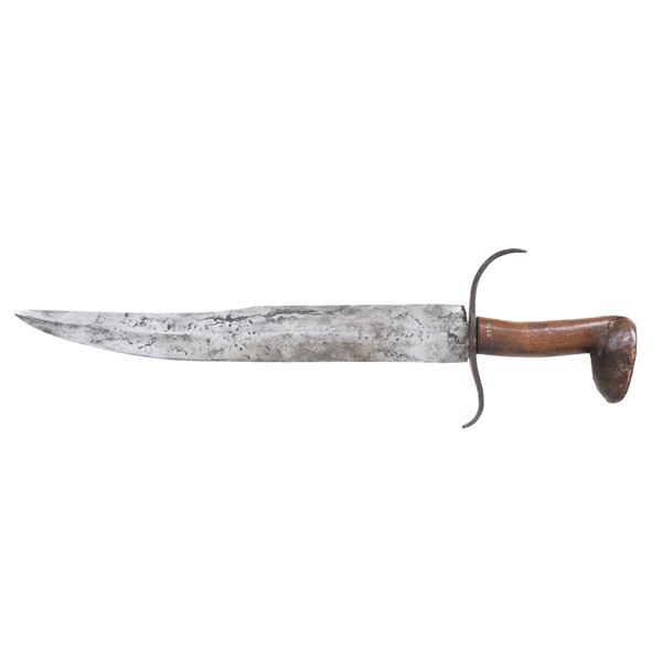 19" overall, 14" clip point blade, 2" wide, .25" thick, and most unusual sharpened on both sides. Sharpening on both sides took a lot of filing and the tool marks are still present on this hand forged blade, 6" iron "S" tapered cross guard. The handle it's made from a piece of burled wood with large flat knob pommel. CONDITION: very good overall, old glue repair to knob the pommel. (02-23988/JS). NON-GUN. $2,000-3,000.