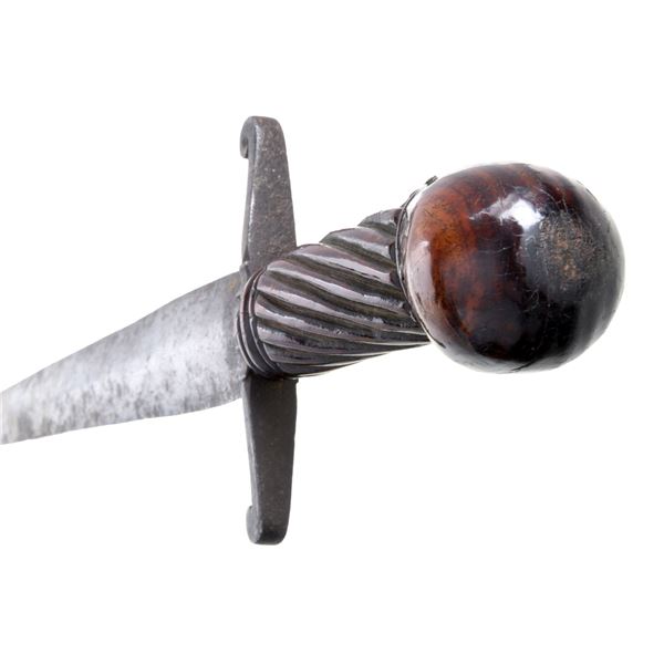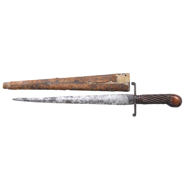 19.5" overall, 14" tapered dagger point blade with central spine, 4" forged cross guard, burl handle, sculpted with spiral cut ribs, silver pins and ball pommel. Scarce whalebone sheath is carved to fit long tapered blade and sewn leather cover. CONDITION: good to very good overall, stained worn tip to blade, fine handle with couple well patinaed chips. The sheath is separating near tip where whalebone pins are loose, leather cover with losses, scuffing, glued repair near tip to keep leather in place. (02-23993/JS). NON-GUN. $2,000-3,000.