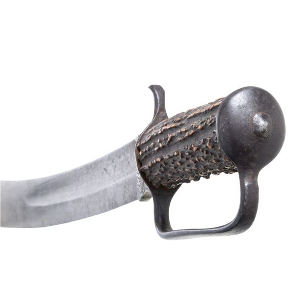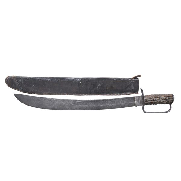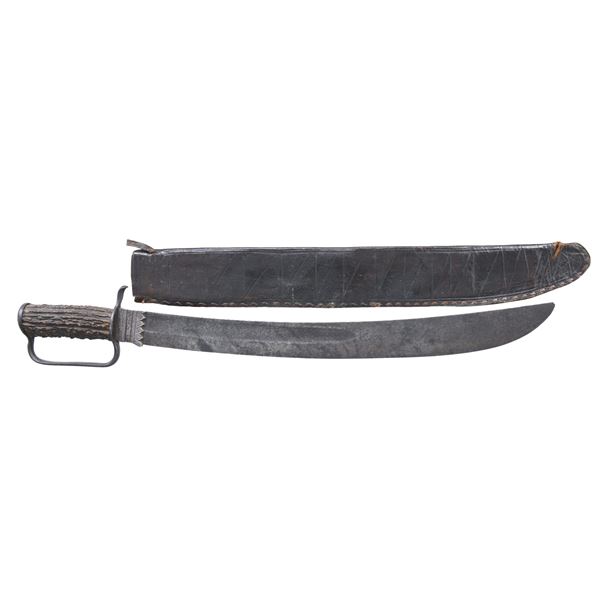 HUNTING SWORD. 22" overall, 17.75" upswept blade, 1.5" wide, sculpted iron D-Guard, well patinaed red stag handle. This unique knife has splendid blacksmith welded ricasso bolster, file sculpted with elegant fig leaf border. Pictured on page 186 of "Accoutrements IV" by James R. Johnston. CONDITION: very good overall, accompanying sheath fits loose, tooled and rawhide stitched. (02-23990/JS). NON-GUN. $1,500-2,000.