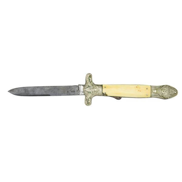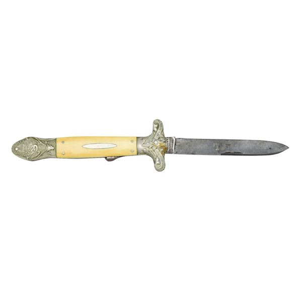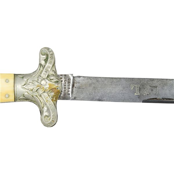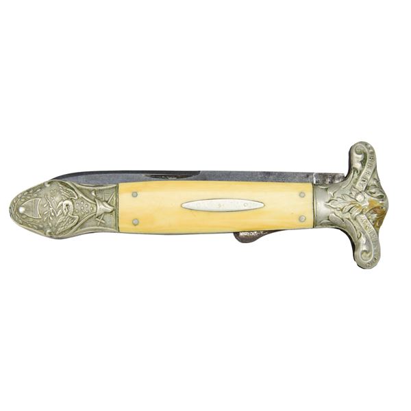 FOLDING KNIFE. 9.75" open, 4.5" spear point blade marked: "I*XL" and "GEORGE WOSTENHOLM SHEFFIELD". German silver bolsters, cross guard "LIBERTY AND UNION", pommel bolster has liberty cap, stars, eagle, and patriotic shield, ivory slab handle. UNATTACHED ACCESSORIES: Custom protective sleeve. CONDITION: very good overall, chip in one well patinaed ivory panel. PROVENANCE: Larry W. Williams lifetime collection-purchased 1975. (02-23270/JS). $1,000-1,500.