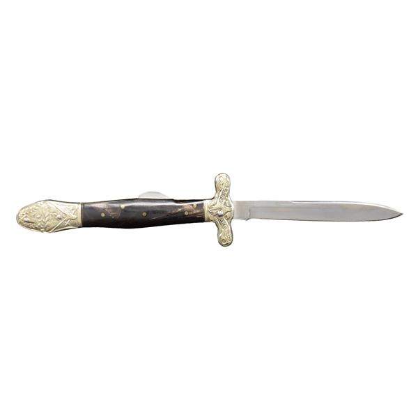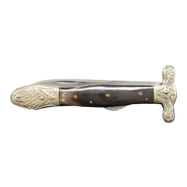 FOLDING BOWIE KNIFE. 4.5" spear point blade, solid cast nickel silver Liberty and Union front guards and Liberty Cap rear bolsters, lock back, black horn handle scales. The blade is lightly etched "ABKA-97" and was one of those presented Antique Bowie Knife Association displaying members displaying 1997 annual show. This was one of a series of reproductions of classic Sheffield knives that Jim Parker and Bill Wright collaborated to make. Bill Wright provided knives from his collection and Jim Parker arranged to have them reproduced in Japan and market them. These knives came to be collectible in their own right. The English cutlery makers picked up the phrase "Liberty and Union" as a patriotic slogan to appeal to Americans, taking it from Daniel Webster's Second Reply on Foote's Resolution, January 26, 1830: "Liberty and union, now and forever, one and inseparable". CONDITION: fine, like new, custom storage sleeve. PROVENANCE: Larry W. Williams lifetime collection. (02-23261/JS). NON-GUN. $600-800.