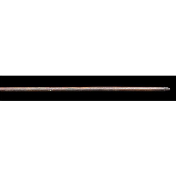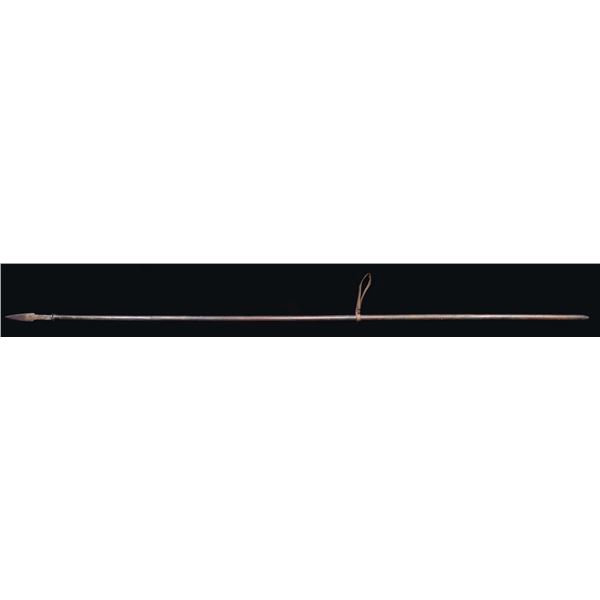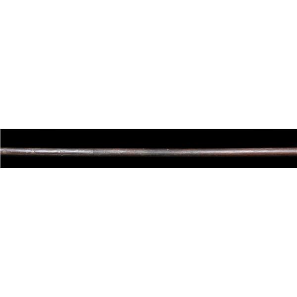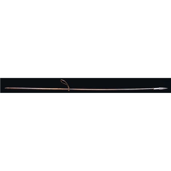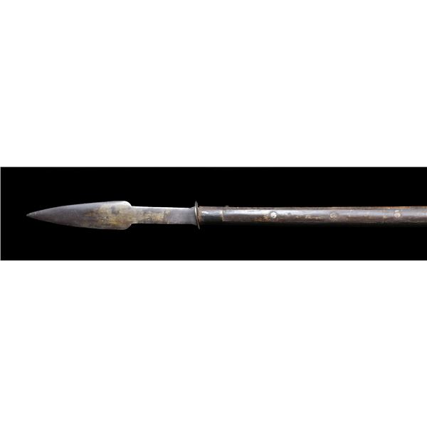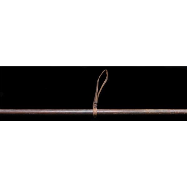 BROTHERS OF RICHMOND, VIRGINIA. This exceptionally rare lance or pike is believed to have been produced by the firm of Burger & Brothers of Richmond, Virginia. Burger was a former partner of Edwin Boyle of Boyle & Gamble fame. There is an extant receipt from Burger & Brothers, dated January of 1862, billing the Confederate States of America for 283 lances and flags. This is the exact style of lance believed to have been produced by Burger & Brothers for the First National style swallowtail cavalry guidon sewn by Constance, Hettie, and Jennie Cary of Richmond. These three patriotic southern belles are also known to have sewn the first Confederate battle flag. The lance measures 108 1/2" overall, including the 9 1/2" spear-point blade at the top. At the base of the blade is a 1 1/2" iron disc atop a 1 3/8" ferrule. The side straps extend 16 3/4" below the ferrule and have four rivets on each side. Amazingly, the three iron tacks that attach the guidon to the top of the lance are still present. The butt of the lance has a 1 1/2" truncated conical iron cap. 42" up from the base is a 9 1/2" leather loop to aid in carrying the lance. The pole is beveled to maintain the position of the strap. Please note that this lance is the exact type issued and used with the cavalry guidon offered in the previous lot. CONDITION: this lance must rank among the finest known examples of this rare Confederate arm. Not only is it undamaged in any way, it has the original tacks for mounting the guidon and the leather strap for carrying the lance when in the saddle. (02-23589/BF). $2,500-4,000.