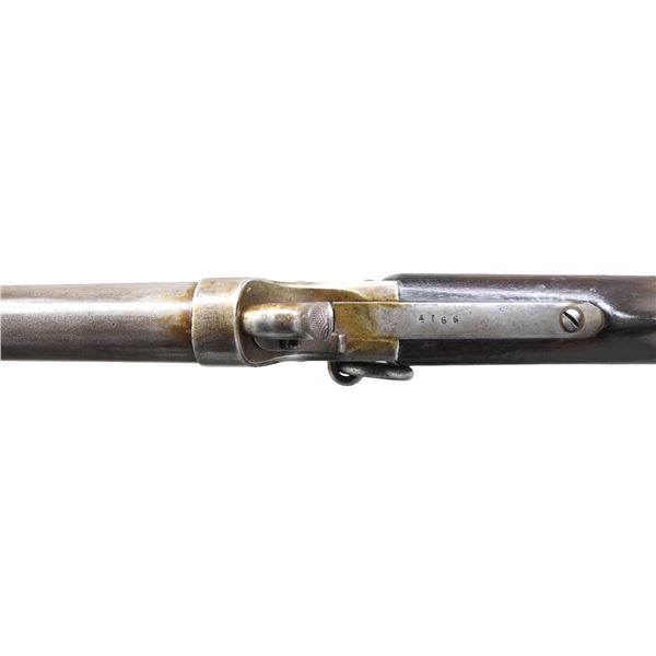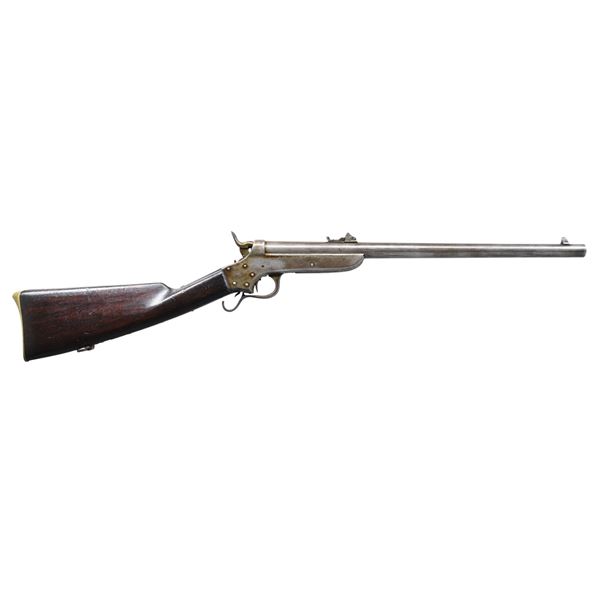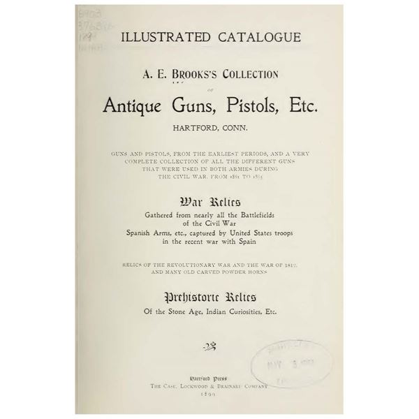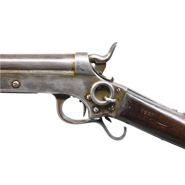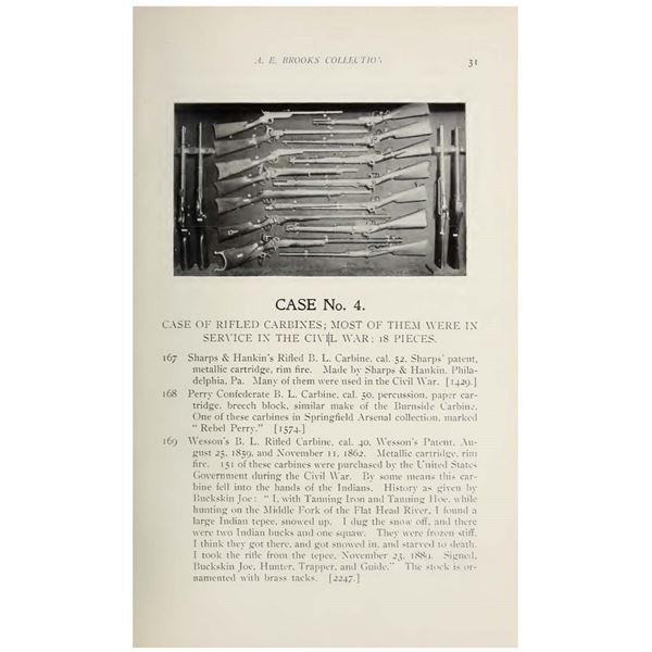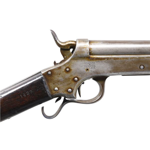 CAVALRY CARBINE FROM AE BROOKS COLLECTION. Cal. 54 S# 4166. About 500 short barrel 19" carbines were made, most issued to 3rd NY Cavalry. Frame is marked: "SHARPS / & / HANKINS / PHILADA" on the right side, "SHARPS / PATENT / 1859" on the left. Stamped into stock on both sides is AE Brooks inventory #1429 and this gun is shown and described on page 31 of the 1899 published catalog of his remarkable collection. It's nice to find an example of this carbine in original unaltered condition with published collection provenance going back 125 years. Flayderman in his price guides warns against deceptive altered Navy 24" carbines as original cavalry examples are very scarce. UNATTACHED ACCESSORIES: copy of pertinent pages from the 1899 Brooks catalog showing this gun. CONDITION: very good overall, matching serial numbers, traces of original nickel finish, overall gray metal. Mechanically fine with bright rifled bore. (01-26025/JS). ANTIQUE. $3,000-5,000.