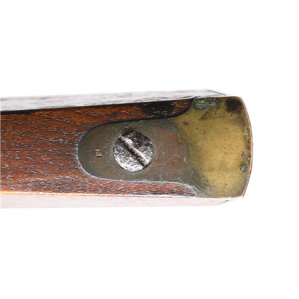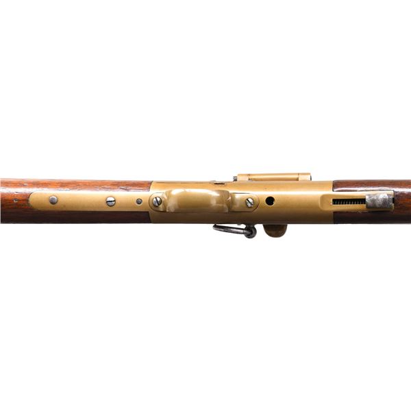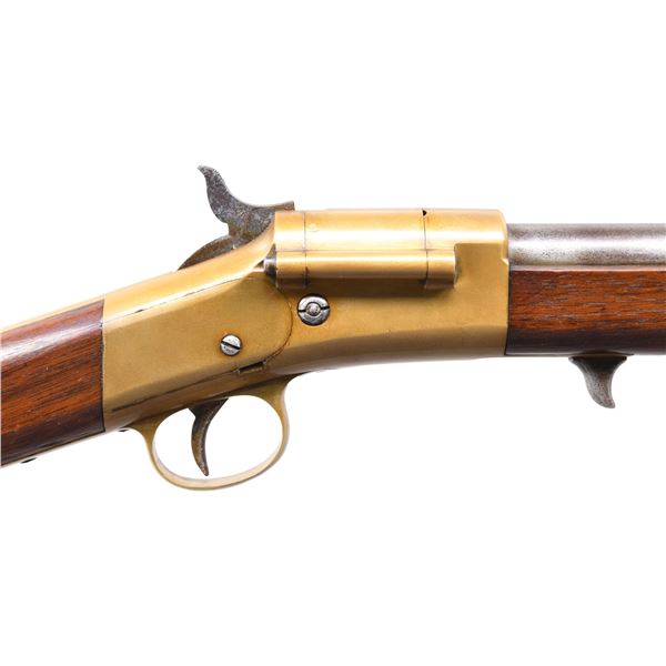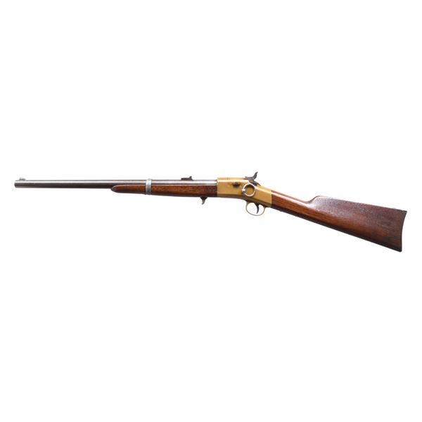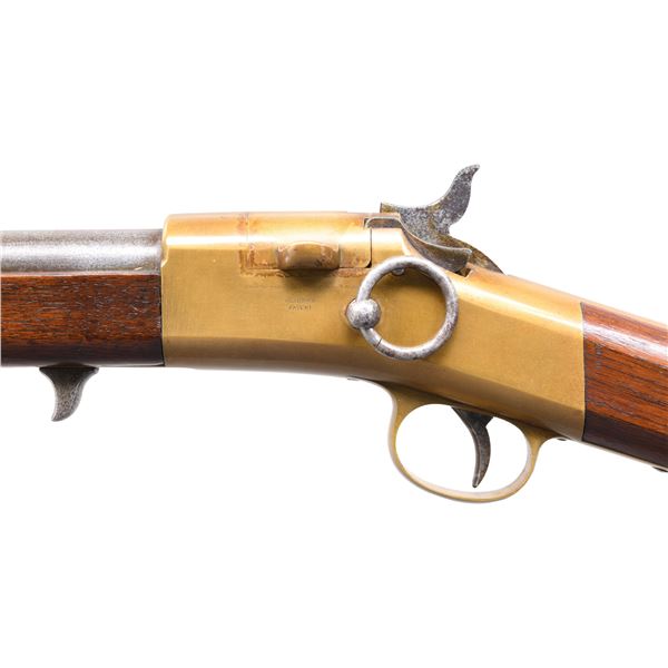 LOADING CARBINE. Cal. 52. NSN. This popular & scarce brass-framed carbine has a swinging breech block like the British Snider action. To open the action, the thumb lever adjacent to the hammer is depressed & the breech block is released by upward pressure on the hook projection. The shell extractor beneath the fore stock is manually operated by pushing rearward. Warner carbines were known issued to the 3rd Massachusetts Cavalry & 1st Wisconsin Volunteer cavalry. CONDITION: very good overall, complete & matching. Iron is mottled gray patina with pitting. Brass frame has toned medium mustard patina, patent markings on left side only partially discernible. Stock is fine with areas of raised grain. Mechanically fine, crisp deep rifled bore. (01-26020/JS). ANTIQUE. $4,000-5,000.