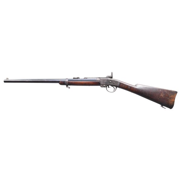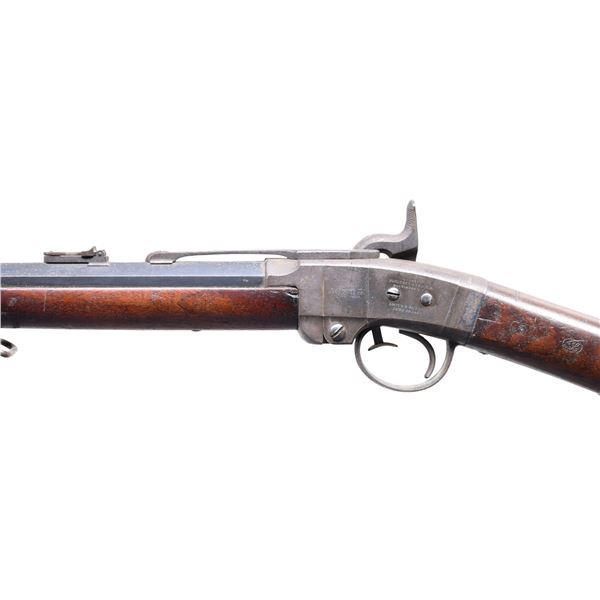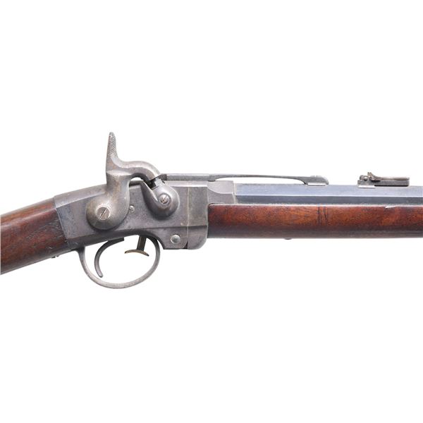 Cal. 50. S# 6675. Standard configuration for this popular breech loading saddle ring carbine, 21-5/8" octagonal to round barrel, iron mounted, case colored & blued. On the left side of breech is marked "ADDRESS / POULTNEY&TRIMBLE / BALTIMORE U.S.A."; "SMITH'S PATENT / JUNE 23 1857"; & "MANUFACTURED BY / MASS ARMS CO / CHICOPEE FALLS", both Mass Arms & American Machine Works made this contract, all purchased by US government, total production about 30,000. Some of the earliest serial guns were issued to 1st Mass Cav, 2nd WV Cav, 11th Ill Cav, 11th Ill cav. This proved to be one of the best carbines used during the war. CONDITION: very good condition, complete & original, all matching. Uncleaned and "as found" retaining considerable blue finish on barrel, frame has traces of case color under a stained and soiled layer, good markings, stocks are sound with scattered cosmetic blemishes, too bright cartouches. Mechanics are excellent w/bright shiny bore. (01-26331/JS). ANTIQUE. $1,200-1,500.