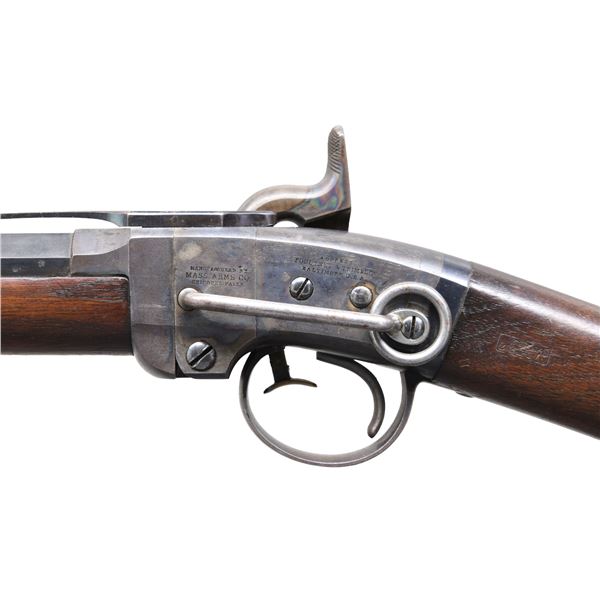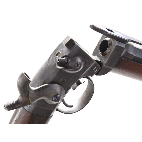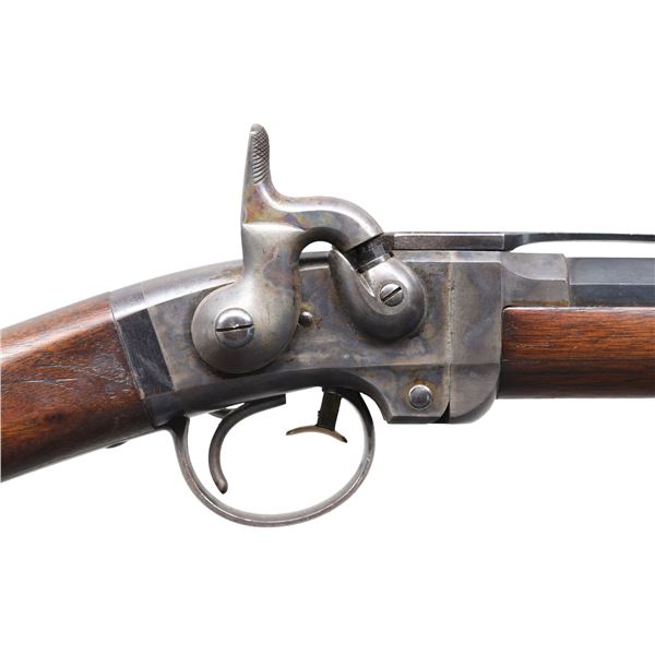 Cal 50. S# 19404. There are about 20 carbines issued to 11th Illinois cavalry according to Springfield Research in serial range 18673-19764, this number is not listed but 19407 was issued to the 11th. This carbine saw little use and retains most all of its original bright finish. Standard configuration, 21-5/8" part octagonal to round barrel, iron mounted, blue and case color finish. Left side of breech is marked "ADDRESS / POULTNEY&TRIMBLE / BALTIMORE U.S.A."; "SMITH'S PATENT / JUNE 23 1857"; & "MANUFACTURED BY / MASS ARMS CO / CHICOPEE FALLS". CONDITION: fine to excellent overall, barrel retains 95% plus original right the blue finish, frame retains about 70% muted case colors, much original fire blue is found on frame ferrule & barrel to frame latch. Stocks are fine with two bright inspector cartouches. Mechanically fine with bright shiny rifled bore. (01-26017/JS). ANTIQUE. $2,500-3,500.