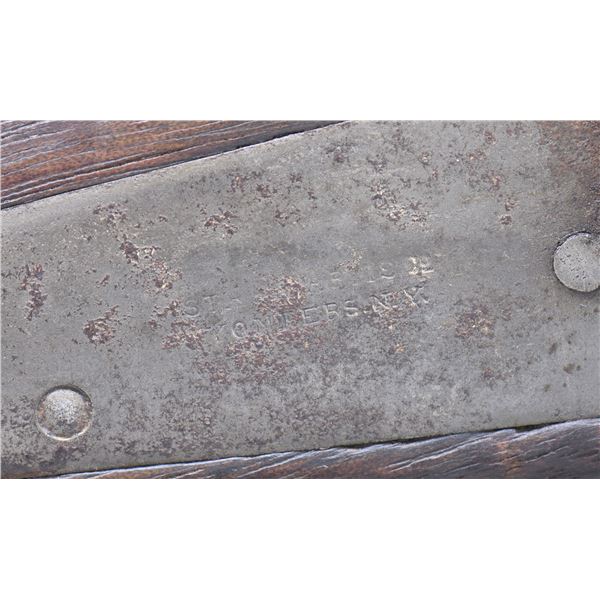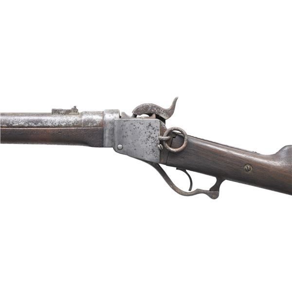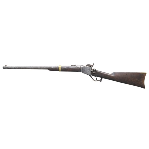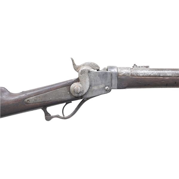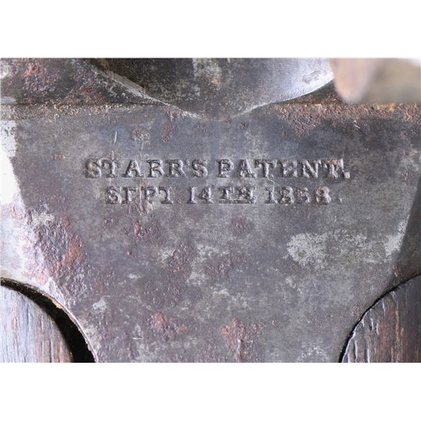 Cal. 54. S# 12837. Standard configuration of lever operated falling breech, brass mounted, blued 21" barrel, two position rear sight, patent markings on breech & barrel, "STARR ARMS CO / YONKERS NY" stamped on lock. Similar linen cartridge ammunition similar to the Sharp's Carbine which it resembled. Over 20,000 made and most all issued. Starr carbines were issued to many regiments, and several hundred S#s found in National Archive records in this serial rage were issued to the 1st Arkansas Cavalry, S#s 12829, 12850 are the closest on either side of this survivor. CONDITION: good overall. Metal cleaned mottled gray with pitting, barrel and lock markings are discernible. Stock is refinished, outline of inspection cartouche still visible. Mechanics fine, dirty dark rifled bore. (01-26333/JS). ANTIQUE. $800-1,200.