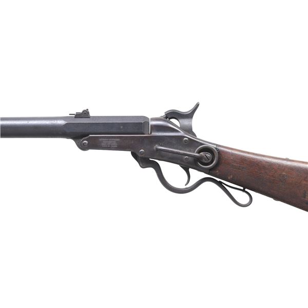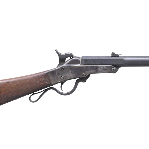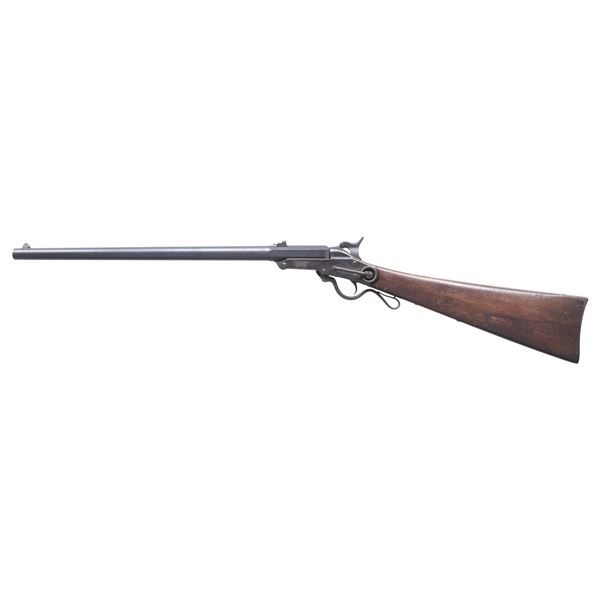 Cal. 50. S# 20213. 2nd model Maynard in standard configuration, 20" blued octagonal to round barrel, adjustable 2-leaf rear sight, case hardened frame with 4-line patent and 3-line manufacturer's address on either side. CONDITION: very good overall, some thin blue finish, metal overall dark patina, crisp markings, stock has scattered small cosmetic blemishes, 2 crisp inspector cartouches. Mechanics are crisp, bright shiny rifled bore. (01-26342/JS). ANTIQUE. $800-1,200.