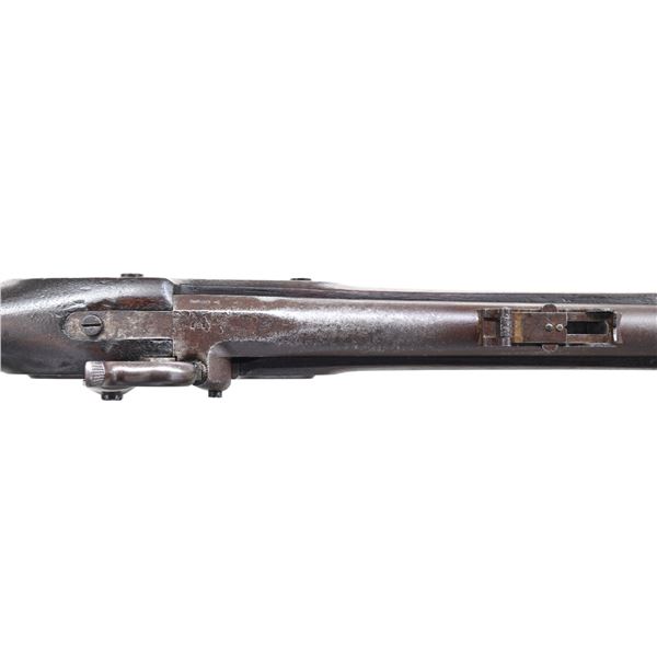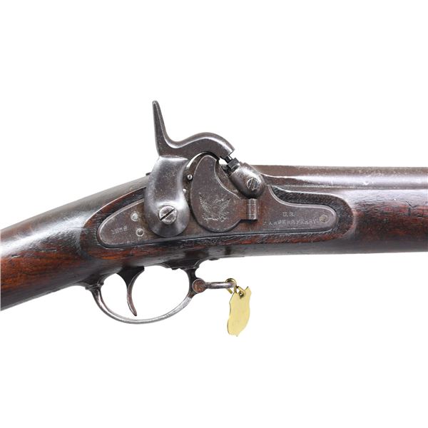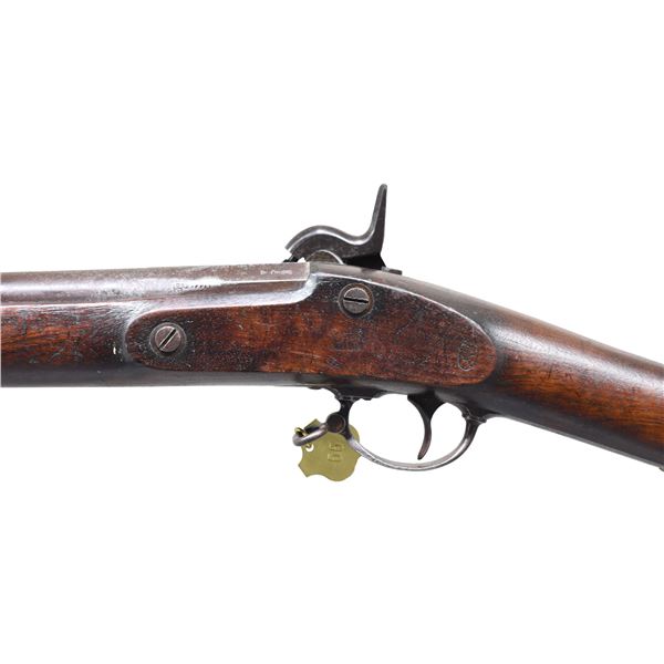 MUSKET. Cal. 58. NSN. This "as found" early 1855 rifled musket is standard configuration, 40" barrel, long range rear sight, VP-eagle head proofs, "1858". Lock has matching 1858 date "U.S. / HARPERS FERRY", eagle stamped on Maynard tape door. Two very good inspector cartouches stamped in stock opposite lock, brass nosecap, early thin swelled ramrod. This is a fine survivor, with excellent markings. CONDITION: very good to fine overall, metal has a smooth iron patina, Barrel is bright in protected areas under bands, stock is sound and well fit, well discerned cartouches. Mechanically fine, bright shiny bore. (01-26563/JS). $2,500-4,000.