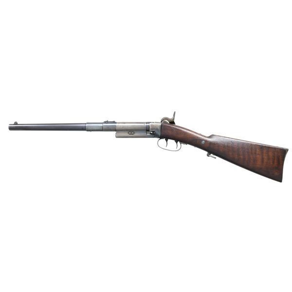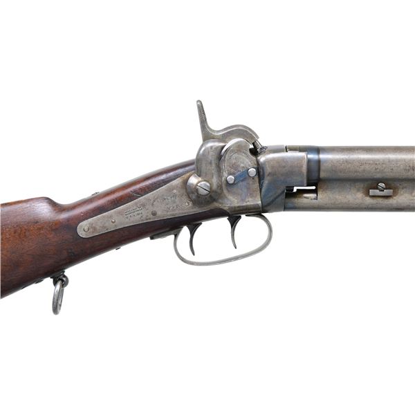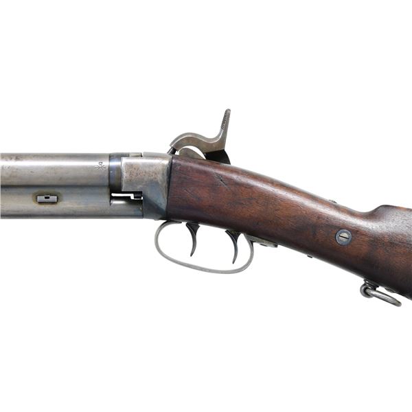 Cal. 54. S# 520. Bbl is 18" w/ blade front sight and graduated leaf rear sight. Bbl pivots to left and rotates downward to right for loading, bbl release is located forward of trigger. Lock has a Maynard tape primer feed. Lock is marked "MASS. ARMS CO / CHICOPEE FALLS / USA 1856" and a large crown over the cipher of Queen Victoria "VR". Breech end of bbl and top of receiver have British markings. Blue and case colored finish. Walnut stock w/ iron buttplate and patchbox. Right side of stock is stamped "U.S. 1". Left side of stock is stamped "U.S.". 2,000 were produced under contract for British government in 1855 for use in the Crimean War. CONDITION: bbl and action retain over 70% lightly faded blue w/ case color finish. Stock has lightly worn finish showing handling marks and small dents. Sound action. Very good bright bore w/ strong rifling. (01-26858/DS). ANTIQUE. $3,000-4,000.