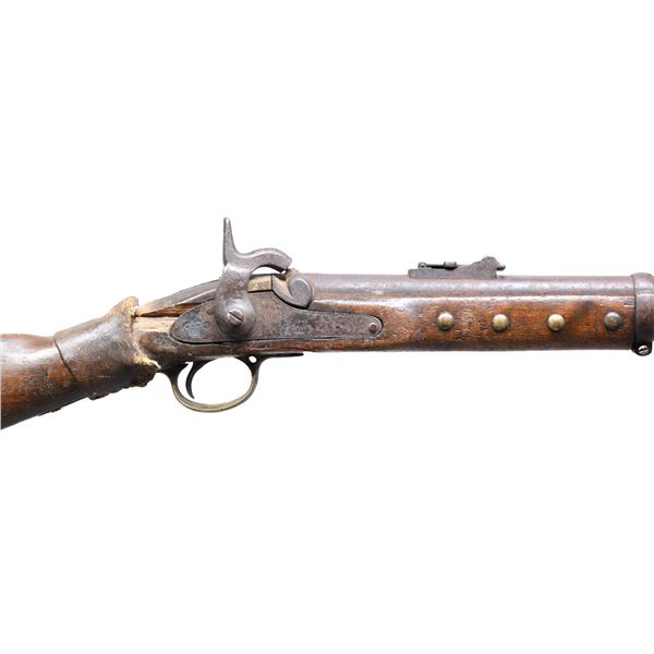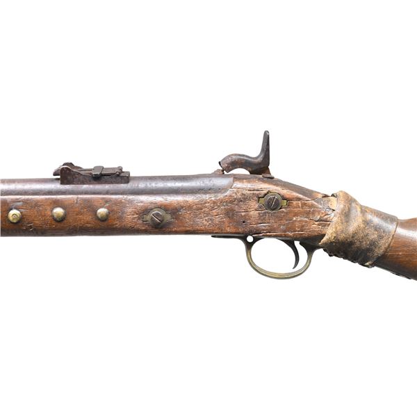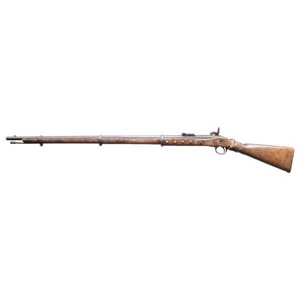 NATIVE AMERICAN USAGE. Cal. .577. NSN. Bbl. 39 1/4". This represents one of the most interesting British Enfield rifles that we have offered at auction. It is of classic M1861 form and was likely imported to this country for use during the American Civil War by either Union or Confederate forces. It would appear that during a pitched battle the rifle was broken at the wrist. It was likely scooped up by a Native American, possibly Cherokee, and brought back to his village where it received a wrist repair and brass tack decoration. Thus, a useless weapon was salvaged and saw many more years of service with Native Americans. The gun, itself, has a round bbl with a lug sight near the muzzle and a folding elevation sight near the breech. British proofs can be seen on the left side of the bbl opposite the nipple. The lockplate is marked "1861 TOWER" under the nipple and shows a crown behind the hammer. Brass trigger guard, buttplate, and nosecap. Iron bbl bands and original ramrod. The forestock has 4 brass tacks on each side, in front of the lockplate. The right cheek of the buttstock has a circle of 9 tacks, which likely represent the 9 districts of the Cherokee Nation. There is another single tack at the center of the circle likely representing the single nation born of the 9 districts. The wrist shows a glue and tightly laced shrunken rawhide repair. CONDITION: iron parts generally have a dark oxidized finish. Nipple is broken. Hammer is likely a replacement. The lock holds only one cocking position. Stock shows moderate overall wear and, as stated, there is a repaired break at the wrist. (01-26212/BF). ANTIQUE. $1,000-2,000.