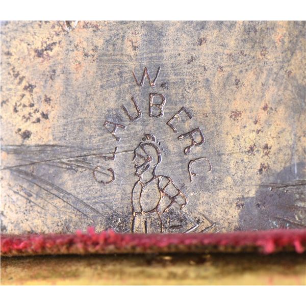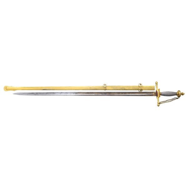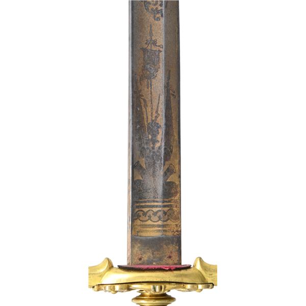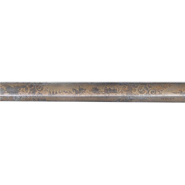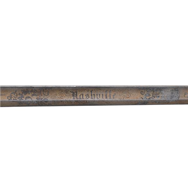 SWORD WITH "NASHVILLE" BATTLE HONOR ETCHED ON THE BLADE. Overall length: 41". Blade length: 32". The blade is etched over 2/3 of its length w/ military trophy stands & foliate motifs as well as a battle scene & the battle honor "Nashville" in a central panel. There are vivid gold highlights throughout the etching. The single fullered blade is marked at the ricasso, "W. CLAUBERG (knight) SOLINGEN". The artistically executed cruciform hilt has pineapple/pinecone finials on the ends of the crossguard. The top of the guard has a quatrefoil & a fleur de lis motif. The pommel is of swelled circular form & is topped by another pineapple/pinecone finial. A chain guard extends from one branch of the guard to the circular pommel. The vertically reeded grip is executed in solid silver. The gold plated brass scabbard is engraved w/ foliate motifs & an American eagle sitting atop a federal shield. This exact sword is pictured in the Tiffany & Company catalog titled, "Presentation Swords". Parts of the catalog have been vividly & accurately reproduced in Thillmann's book titled, "Civil War Cavalry & Artillery Sabers". The title of the page that this sword is illustrated on is "Straight Swords for Generals". To our knowledge this is the only example of this exceptionally rare Tiffany sword to ever come to market. Given the extremely rare "Nashville" battle honor on the blade, it was likely given to one of the commanding Union generals present during the Battle of Nashville on December 15-16, 1864. An exceptional rarity for the United States sword collector, Nashville collector, Tiffany collector or anyone who appreciates fine American military rarities. CONDITION: blade has a light gray, slightly mottled patina. The etching remains quite clear & the vast majority of gold highlights are still present. The gilding on the hilt is 98%+. The grip has a few very minor shallow dents. The scabbard has nearly all of its gold plating remaining & the engraving remains sharp. There are a few scattered very minor dimples toward the drag. REFERENCE: pgs. 420-424, "Civil War Cavalry & Artillery Sabers" by John H. Thillmann. (02-23603 /BF). $8,000-12,000.