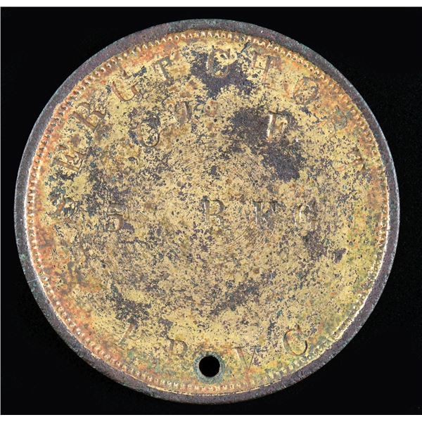 STATION, VIRGINIA. About 1.2" round brass ID tag "AGAINST THE REBELLION 1861" around patriotic "UNION" shield, reverse stamped by sutler "SERGT CH ORT, Co. F, 5 REG PRVC". Sergeant Charles H. Ort enlisted May 15, 1861 in Company F, 5th Pennsylvania Reserve Volunteer Infantry and served till June 11, 1864. Ort was promoted Sergeant just after the Battle of Malvern Hill. The 5th PA took part in most major battles of the army of the Potomac, Including Antietam, Fredericksburg, Gettysburg, The Wilderness, & Spotsylvania Courthouse before mustering out June of 1864. UNATTACHED ACCESSORIES: copy of service records and unit history. CONDITION: fine for excavated tag, retains most of its original gold wash, chocolate brown where gold is missing. (02-24279/JS). NON-GUN. $800-1,200.