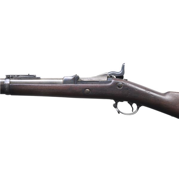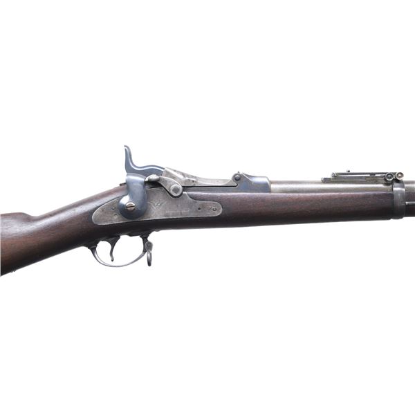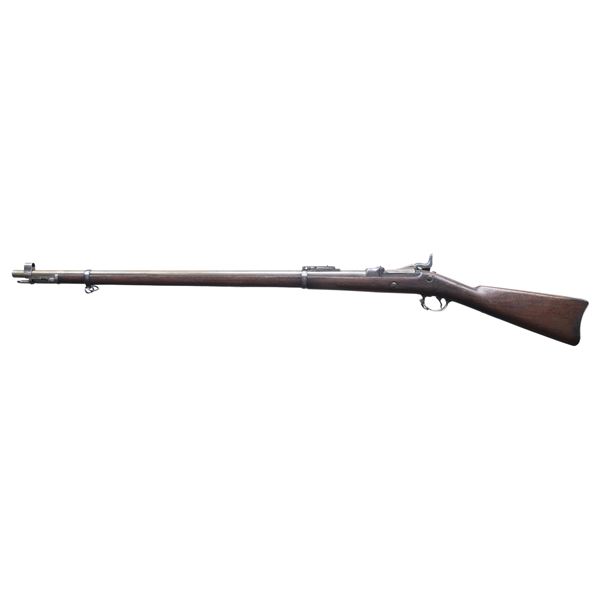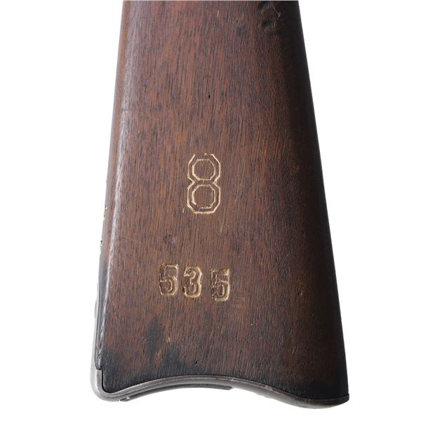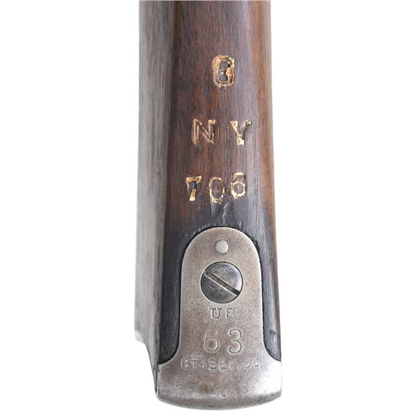 TRAPDOOR RIFLE. Cal. 45-70. S# 380950. Bbl. 32 5/8" fitted w/ a rigid front sight cover. Experimental sliding round ramrod-bayonet differs from the later 1888 production model w/ its short side ears that project outward & single square shoulders at each groove. Total of 1,000 produced for trial use. Very scarce, survival rate is quite low. Buffington rear sight w/o letter stamp. 1884 dated low arch breech block. U.S. marked Springfield lock. Band fastened walnut stock w/ trapdoor buttplate. Left ear of stock has "ESA" cartouche. Right side of stock is stamped w/ a large "8" over smaller "535". Top of comb is stamped "8/NY/706". Peak of buttplate is stamped "US/63/8TH SEP CO". Known serial number range for the 1884 experimental rifle is the 320,000 range. CONDITION: bbl. has gray coloration from touch-up finish showing scattered light pitting. Action & iron fittings retain 50% fading blue. Stock has age darkened appearance showing dents & marks. Bore is generally bright w/ strong rifling. (01-26192/DS). ANTIQUE. $3,000-5,000.