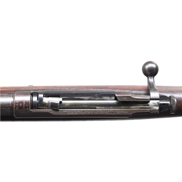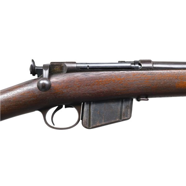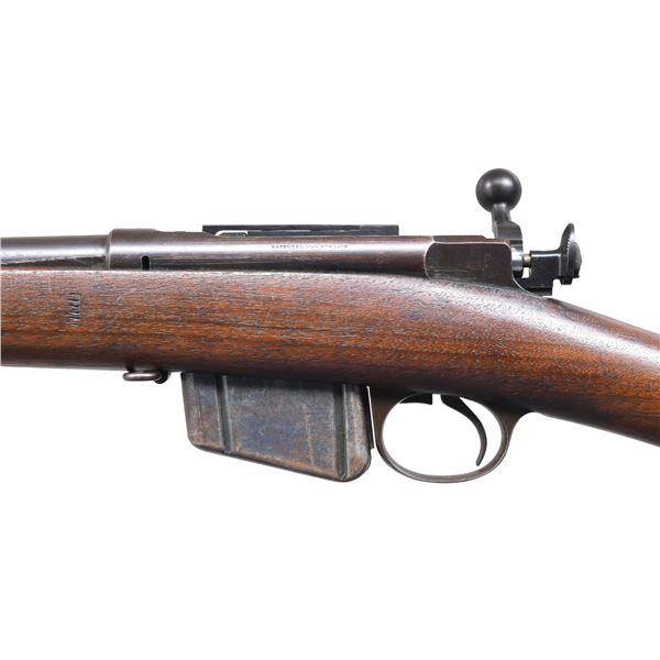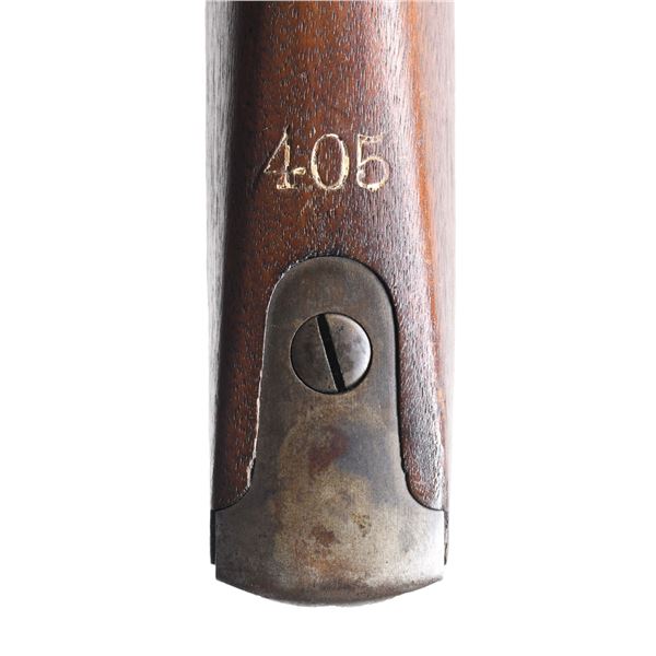 RIFLE. Cal. 45-70. S# 53391. Bbl. 32 3/4". Approx. 5,000 of these 1885s were manufactured by Remington between 1889 and 1893, with the serial numbers beginning at 5001. Receiver ring is marked "U.S.N. (anchor) NO 3.9.6.2 A.C.D." Left receiver rail is marked "REMINGTON ARMS COMPANY, ILION, N.Y. U.S.A. SOLE MANUFACTURERS & AGENTS." Model 1879 rear sight, marked "R" on the right side and graduated to 1200 yds. Blade front sight. Walnut stock, retained by two bands, marked on top of the butt with "405" rack number. Trigger guard carries rear swivel; upper band carries front and stacking swivels. Cleaning rod is present. MAGS: one Lee-Diss detachable 5-round, 2-groove mag. CONDITION: stock set has light wear and scattered handling marks. There is a notable vise mark on the left side below the chamber. Metal retains 70% of its original blue, with notable shallow scratches in the finish on top of the bbl. Very good, shiny bore. PROVENANCE: from the lifelong collection of Bill Peterken. (01-26895/RW). ANTIQUE. $2,000-3,000.