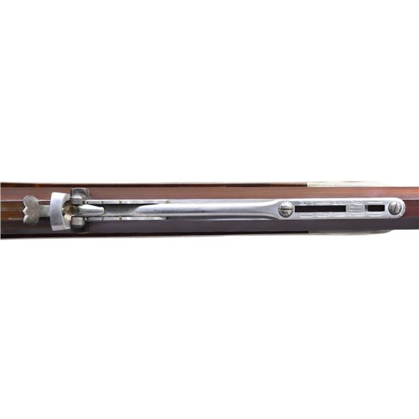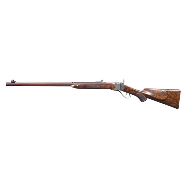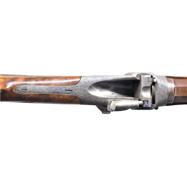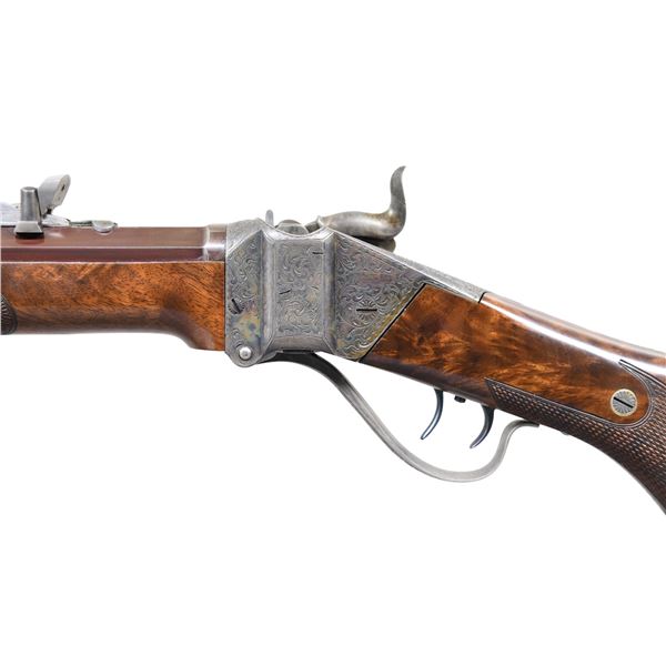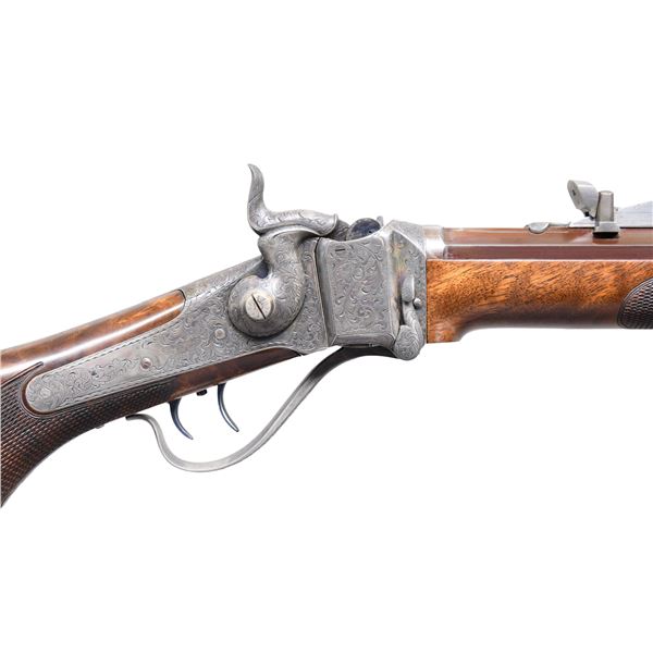 GUN" SINGLE SHOT RIFLE. Cal. 45-70 (45, 2-1/10"). NSN. Judson Brennan is an Alaskan based custom gun maker known for his ornate American Long Rifles & Kentucky style pistols. He is considered by many to be among the world's best. This Sharps rifle build by Brennan is an outstanding reproduction of the rifles built by the Freund brothers who operated the Wyoming Armory in Cheyenne during the buffalo hunting era. Frank Freund designed & patented improvement to the Sharps rifle including the breech block & sights. The finest of the Freund altered rifles known as Boss Guns had features including hand engraving & fancy wood. Today these rifles are highly sought after by Sharps collectors. The action of this rifle has nearly full coverage vine type floral engraving w/ punch dot backgrounds & fancy borders. Features include a Freund style improved breech block & double set triggers. Bbl. 28" octagon measuring 1" across flats at the muzzle. The graduated leaf peep rear sight is of Freund design paired w/ a spirit level globe front sight. German silver capped forearm & engraved steel capped pistol grip stock of exhibition grade black walnut have extensive burl with rich orange & brown tones. LOP: 14-1/4" to a steel shotgun butt plate w/ engraved peak. Weight: 10 lbs, 13 oz. CONDITION: bbl. retains over 95% browned finish showing faint edge wear. Case colored action shows soft dark colors & light carry wear lending a pleasing antique appearance. The wood retains very good finish & checkering showing an open grain check on left side of butt. Butt plate has faded browning finish showing scattered spots. Bright near excellent bore. PROVENANCE: formerly of the Frank Glenn Marsh estate collection. (25-1532/DS). MODERN. $20,000-30,000.