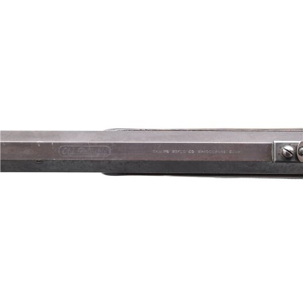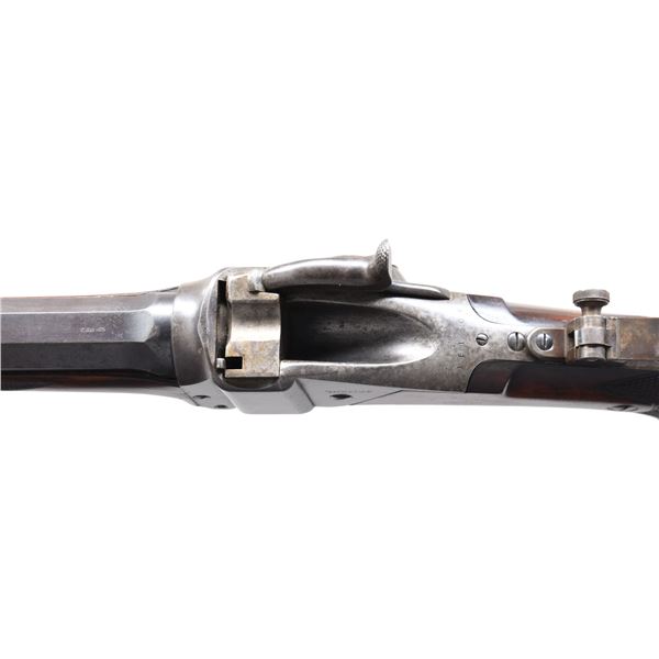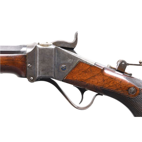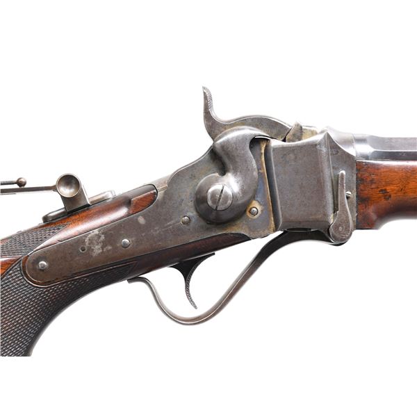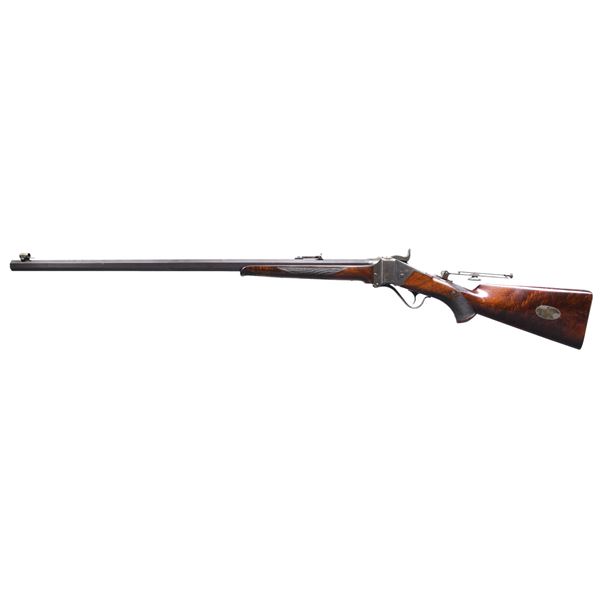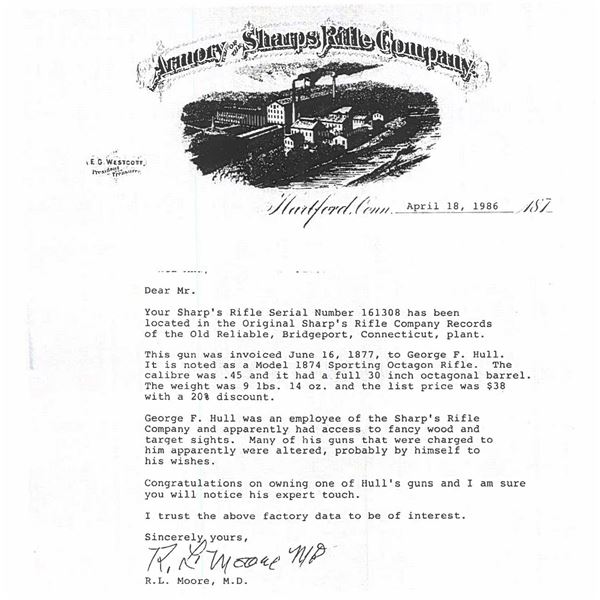 SHARPS EMPLOYEE GEORGE F. HULL. Cal. 45. 2 1/10" (45-70). S# 161308. Bbl. 30" octagon measuring 7/8" across flats at muzzle. Top flat is marked "Old Reliable" w/ "SHARPS RIFLE CO. BRIDGEPORT, CONN." address. Bottom bbl. flat is numbered to the action w/ additional marking "5 10/16". Globe front sight w/ Lawrence patent rear sight & long range Vernier tang sight w/ metal cup eyepiece. Vernier sight is tang mounted on an unnumbered base. This rifle fits the general criteria of a no. 3 mid-range target rifle. Case colored action features a checkered single trigger. Schnable tipped walnut forearm w/ wraparound point pattern hand checkering having an additional triangle of checkering near the tip. Pistol grip stock of fancy walnut w/ checkered steel shotgun butt. Wrist has point pattern hand checkering w/ additional diamonds along both sides of top tang & oval of checkering on bottom of pistol grip. Comb of stock has metal base for Vernier sight attachment. Left side of stock has a German silver oval presentation plate. WEIGHT: 10 lbs, 2.8 oz. UNATTACHED ACCESSORIES: R.L. Moor MD letter dated April 18, 1986 details "Your Sharp's Rifle Serial Number 161308 has been located in the Original Sharp's Rifle Company Records of the Old Reliable, Bridgeport, Connecticut, plant. / This gun was invoiced June 16, 1877, to George F. Hull. It is noted as a Model 1874 Sporting Octagon Rifle. The calibre was .45 and it had a full 30 inch octagonal barrel. The weight was 9 lbs. 14 oz. and the list price was $38 with a 20% discount. / George F. Hull was an employee of the Sharp's Rifle Company and apparently had access to fancy wood and target sights. Many of his guns that were charged to him apparently were altered, probably by himself to his wishes. / Congratulations on owning one of Hull's guns and I am sure you will notice his expert touch." CONDITION: bbl. retains 80% dull blue fading to brown showing scattered spots of freckling & handling marks. Action retains some lightly visible case colors in protected areas w/ balance having a faded brown appearance. Wood has lightly worn checkering & gloss finish showing scattered scratches & small marks. Stock is cracked between the top tang & lockplate. Sound mechanics. Bright bore retains sound rifling. PROVENANCE: Lifelong collection of Richard A. Baumann. (01-26015/DS). ANTIQUE. $8,000-18,000.